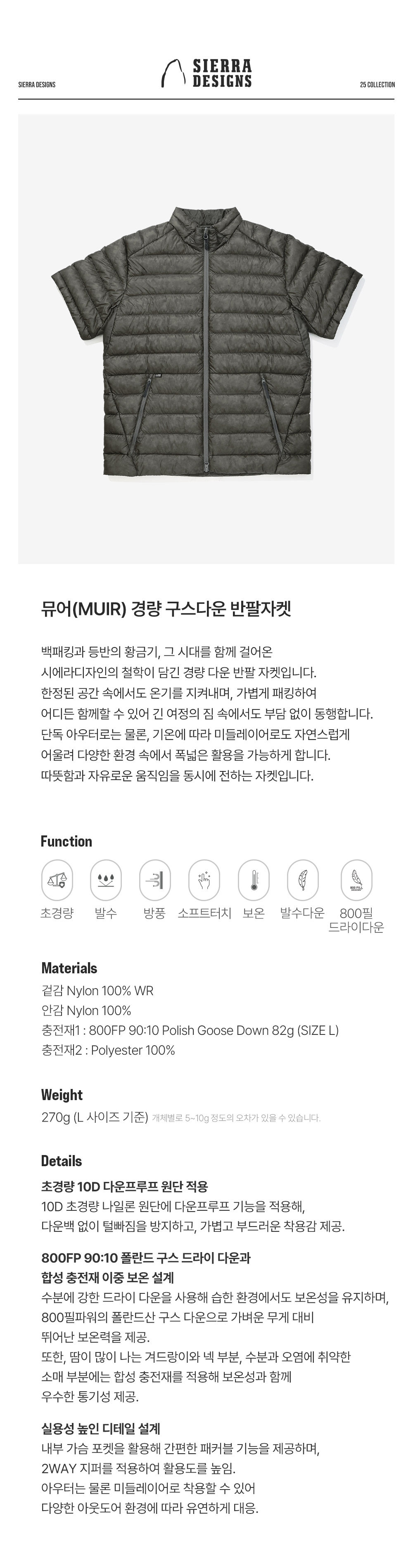 시에라디자인 뮤어 경량 구스다운 반팔자켓 차콜