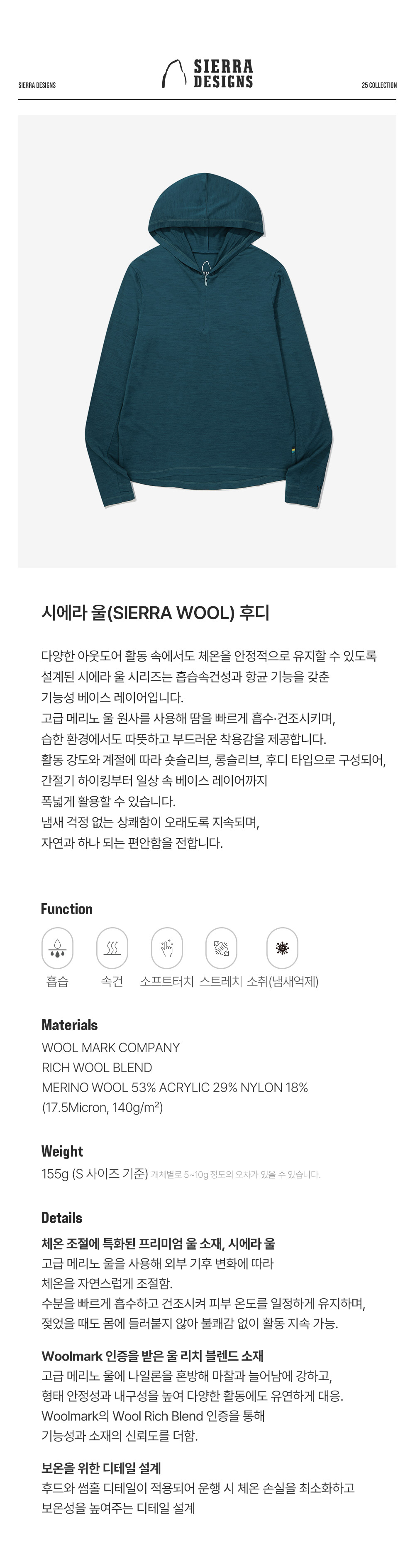 [6% 적립] SIERRA DESIGNS W SIERRA WOOL Hoodie BLUE GREEN