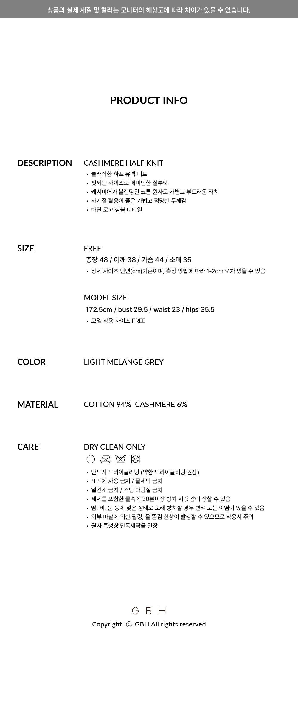 지비에이치 어페럴 캐시미어 하프 니트 / 라이트 멜란지 그레이