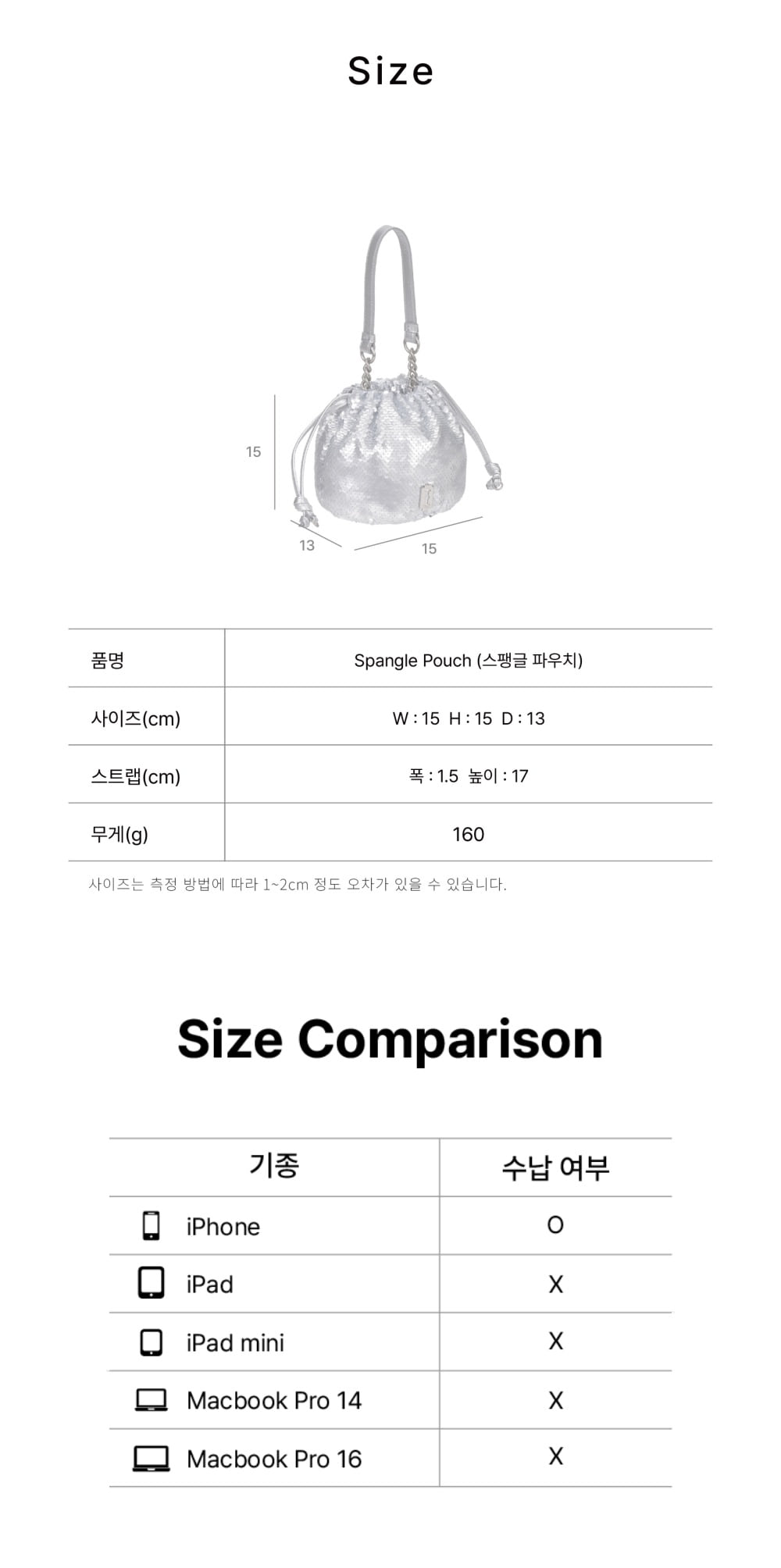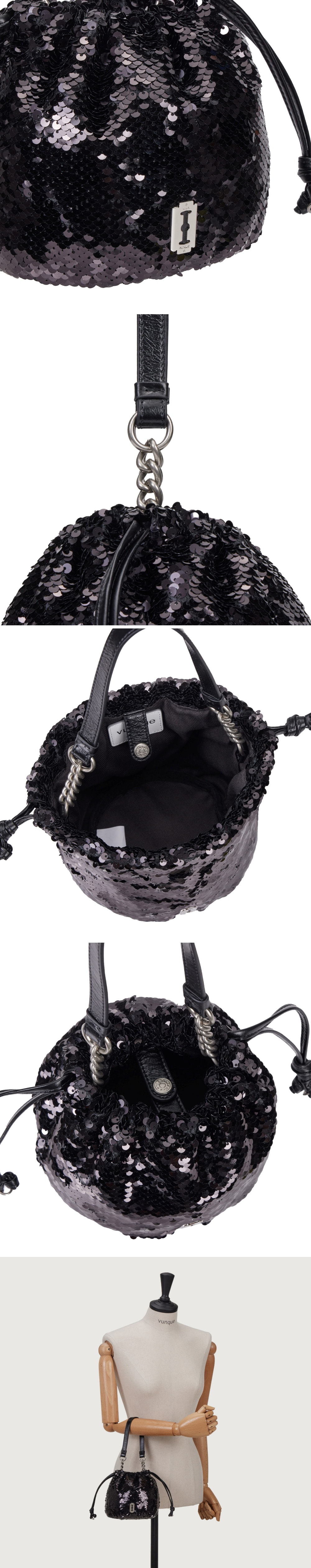 특별한 날 포인트줄 수 있는 스팽글 소재의 파우치- 둥근 쉐입과 볼드한 핸들 체인이 특징상단에 스냅이 있어 더블 클로징이 가능