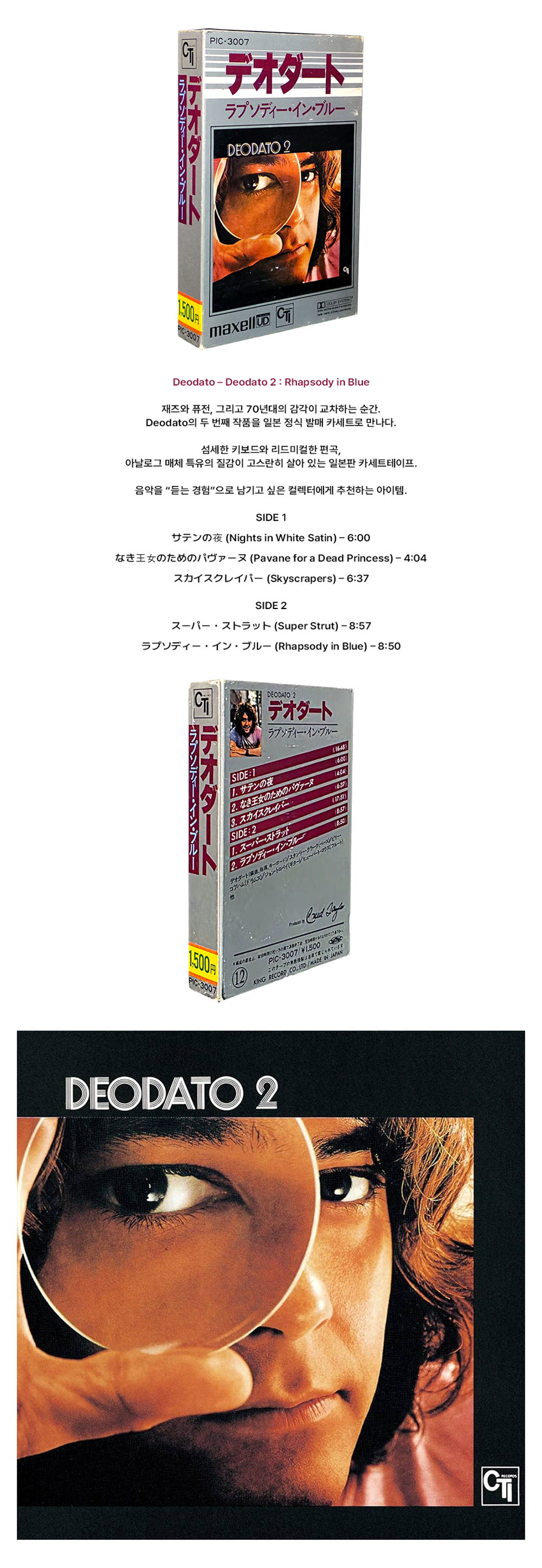Deodato – Deodato 2 : Rhapsody in Blue 재즈와 퓨전, 그리고 70년대의 감각이 교차하는 순간. Deodato의 두 번째 작품을 일본 정식 발매 카세트로 만나다. 섬세한 키보드와 리드미컬한 편곡, 아날로그 매체 특유의 질감이 고스란히 살아 있는 일본판 카세트테이프. 음악을 “듣는 경험”으로 남기고 싶은 컬렉터에게 추천하는 아이템.