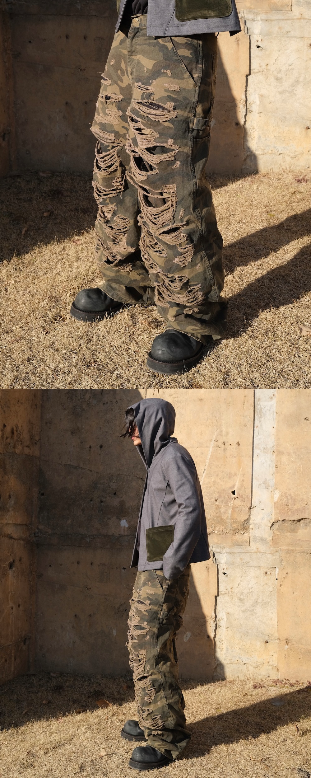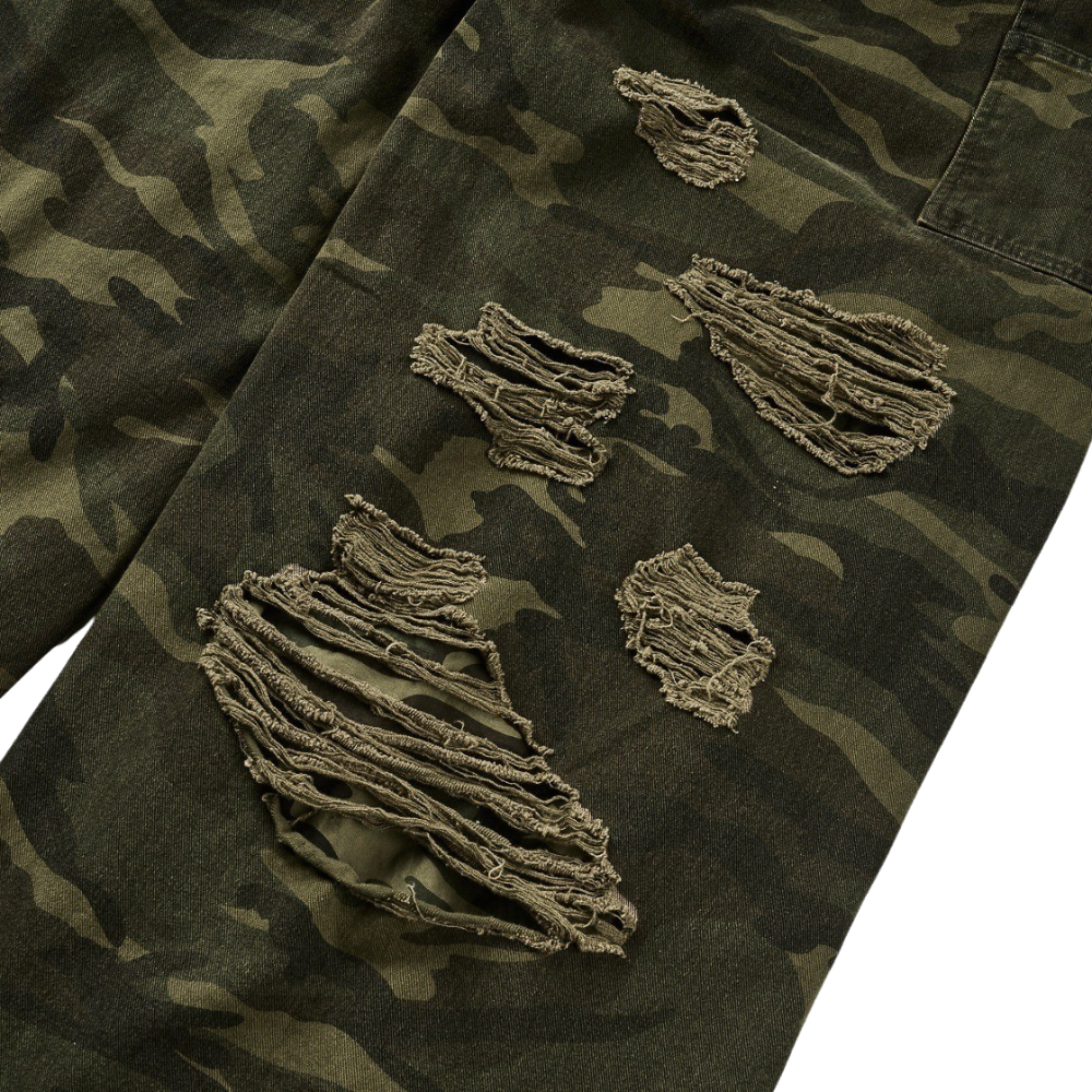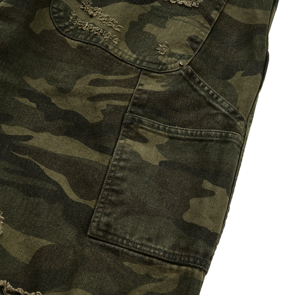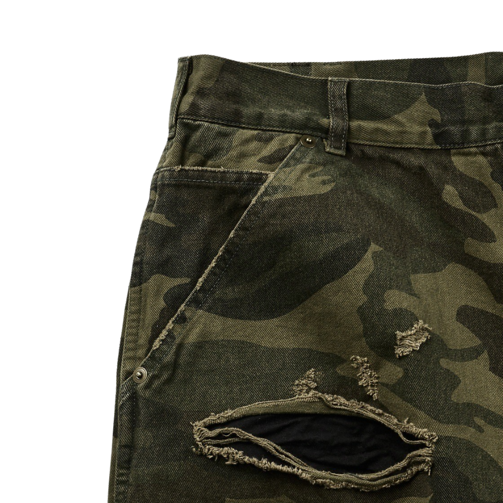 Regular baggy silhouette All-over distressed finish Washed outer camo fabric layer Unwashed inner camo fabric layer * 디스트레스드 디테일은 전 작업 수작업 공정으로 진행하여 개체 차이가 있을 수 있습니다 *
