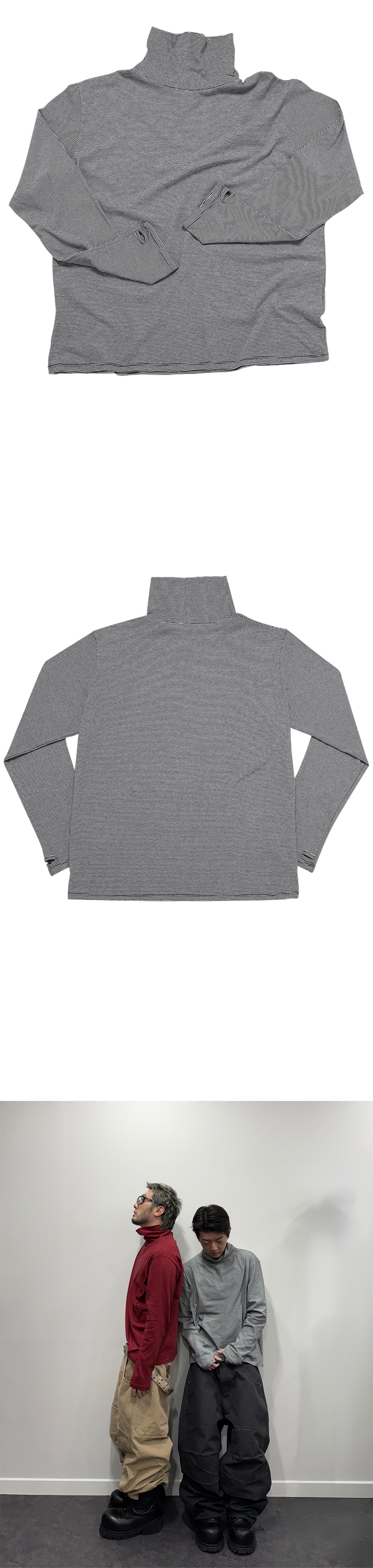 스트라이프 + 핑거홀 + 모크넥 디테일로 단품 또는 아우터 안에 레이어드로 다양하게 연출 가능.