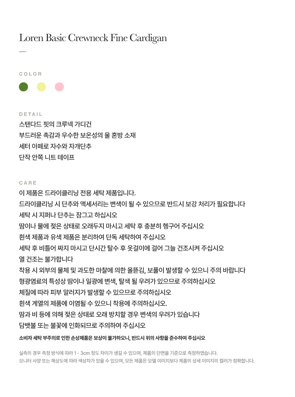[사은품 증정] 세터 우먼 로렌 베이직 크루넥 파인 가디건 올리브 그린
