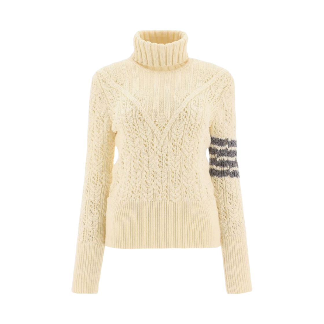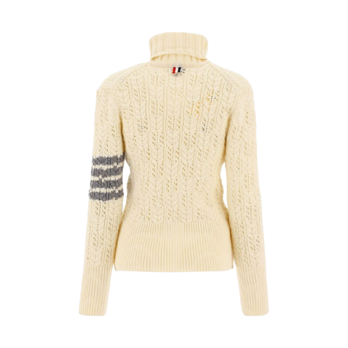 (W) Thom Browne Irish Pointelle Cable Merino Wool 4-Bar Turtleneck White