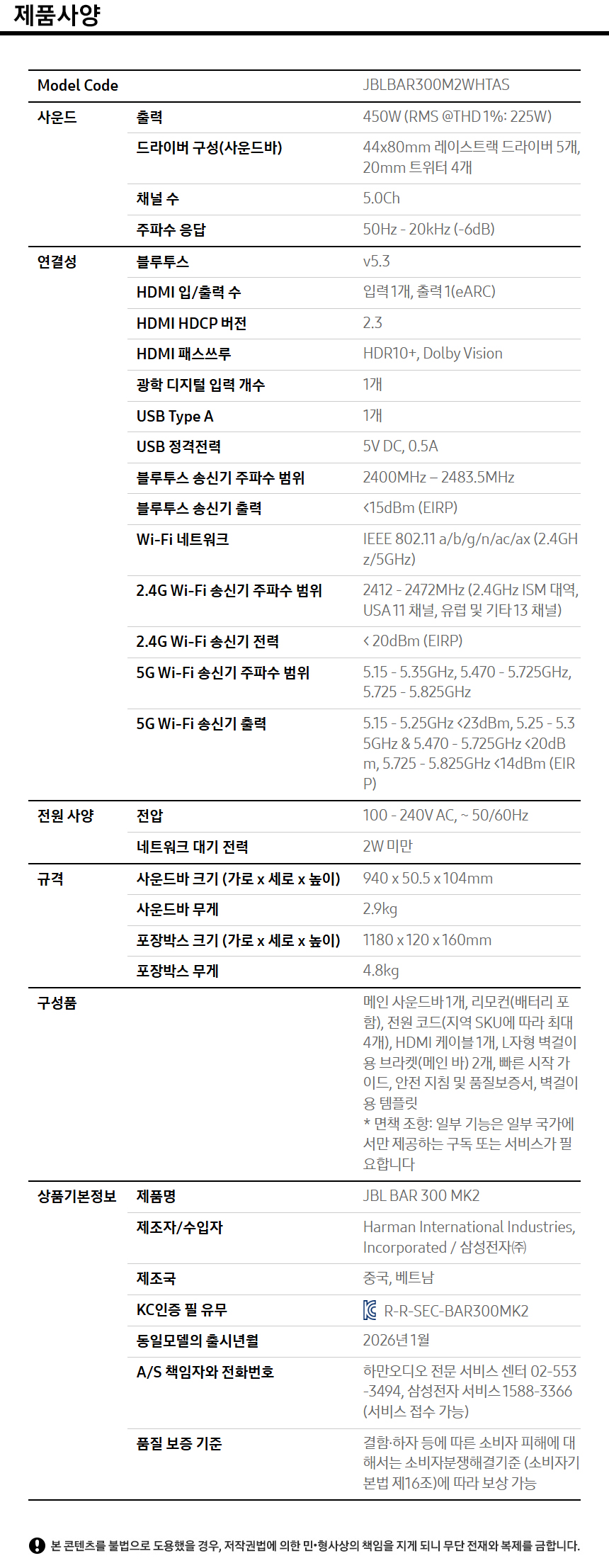 제이비엘 BAR 300 MK2 5.0 채널 사운드바 화이트