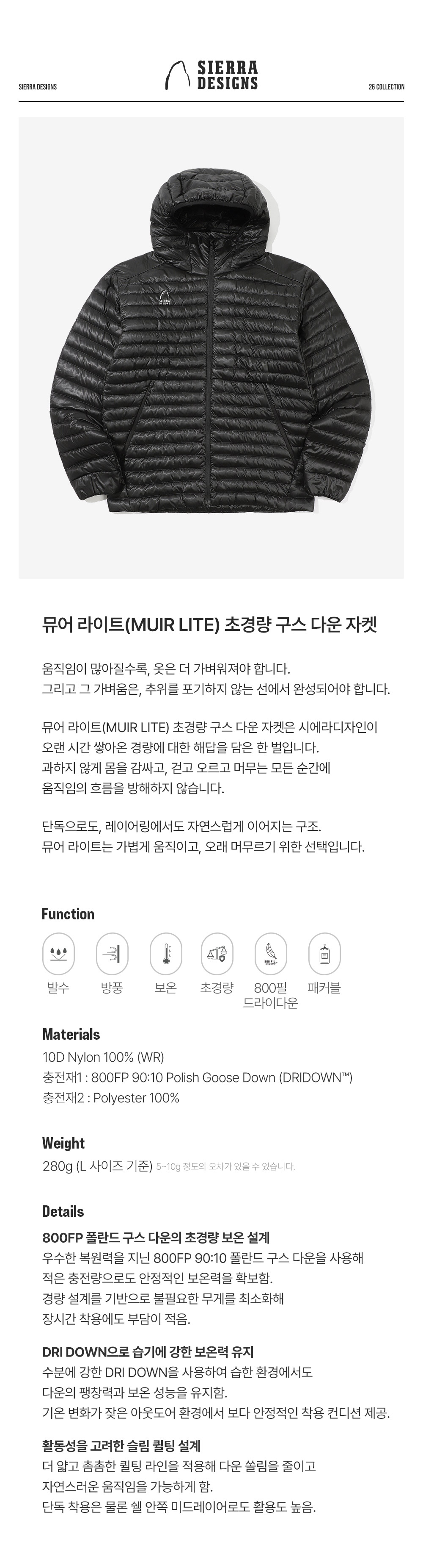 시에라디자인 뮤어 라이트 초경량 구스 다운 자켓 블랙