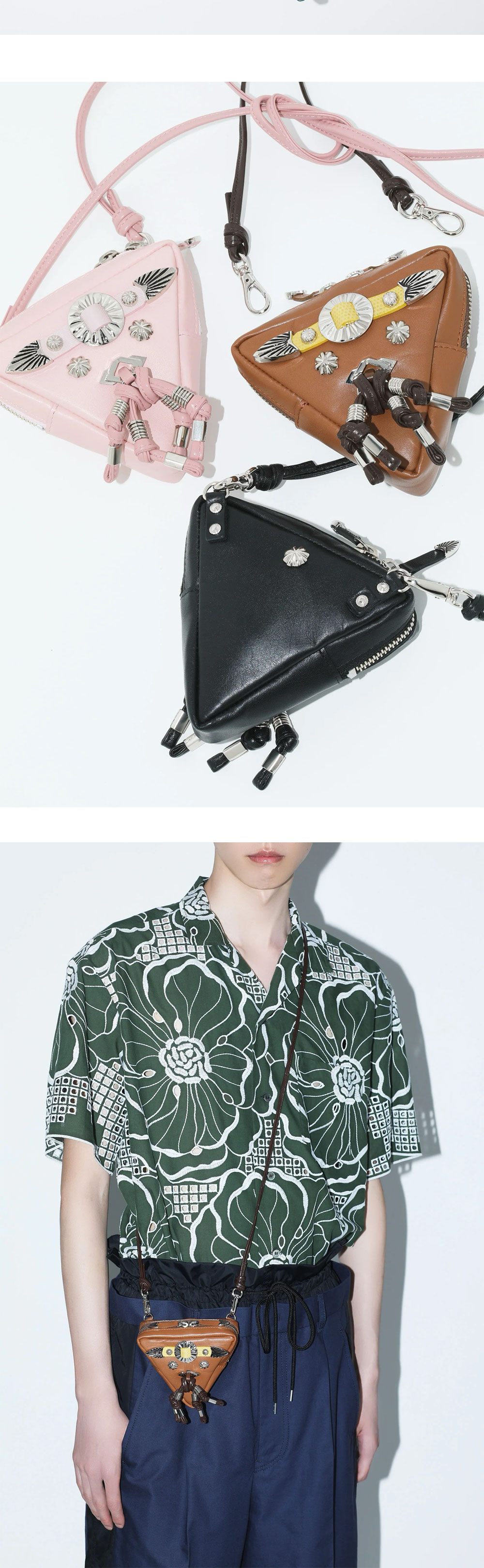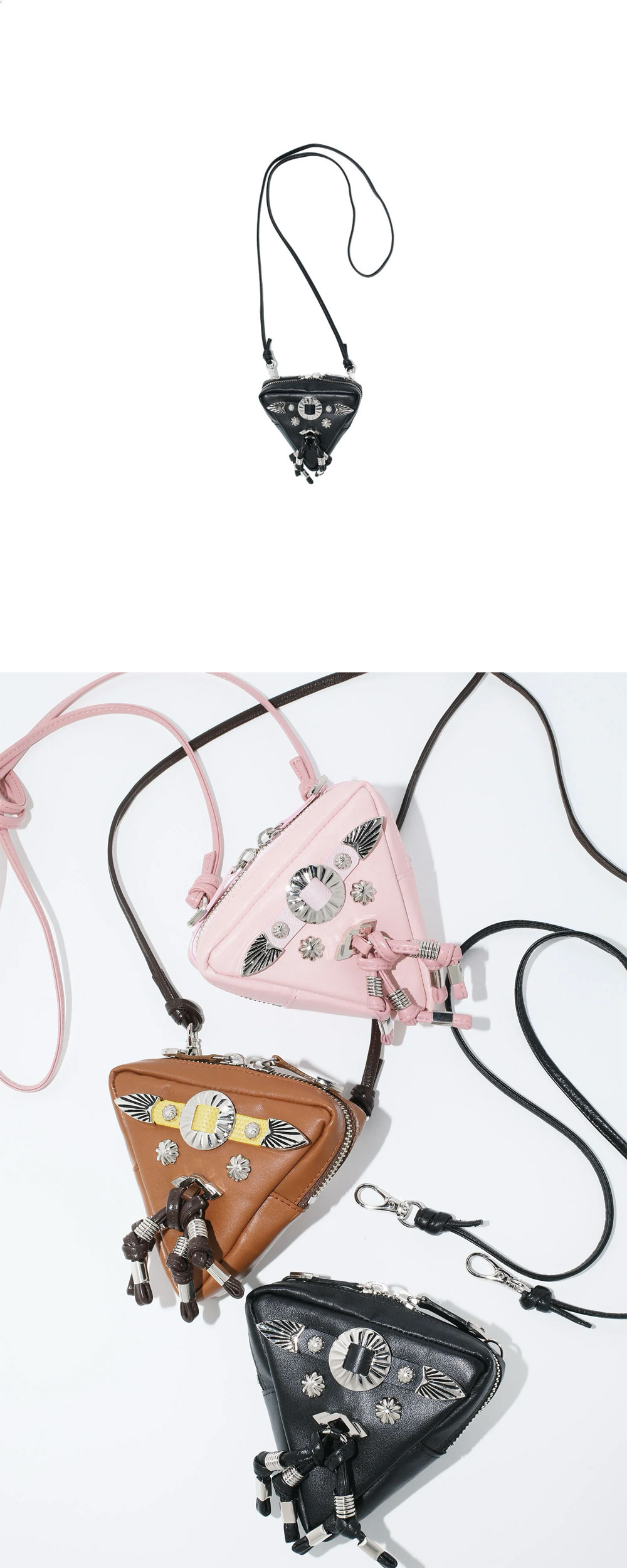 토가 투 트라이앵글 숄더 파우치 블랙입니다. - 독특한 트라이앵글 실루엣이 돋보이는 가죽 파우치 - 탈부착 가능한 숄더 스트랩으로 다양한 스타일 연출 가능 - 천연 소가죽 외감과 레이온 안감을 사용한 견고한 마감 - 토가 특유의 웨스턴 감성이 담긴 메탈 디테일 - MADE IN JAPAN
