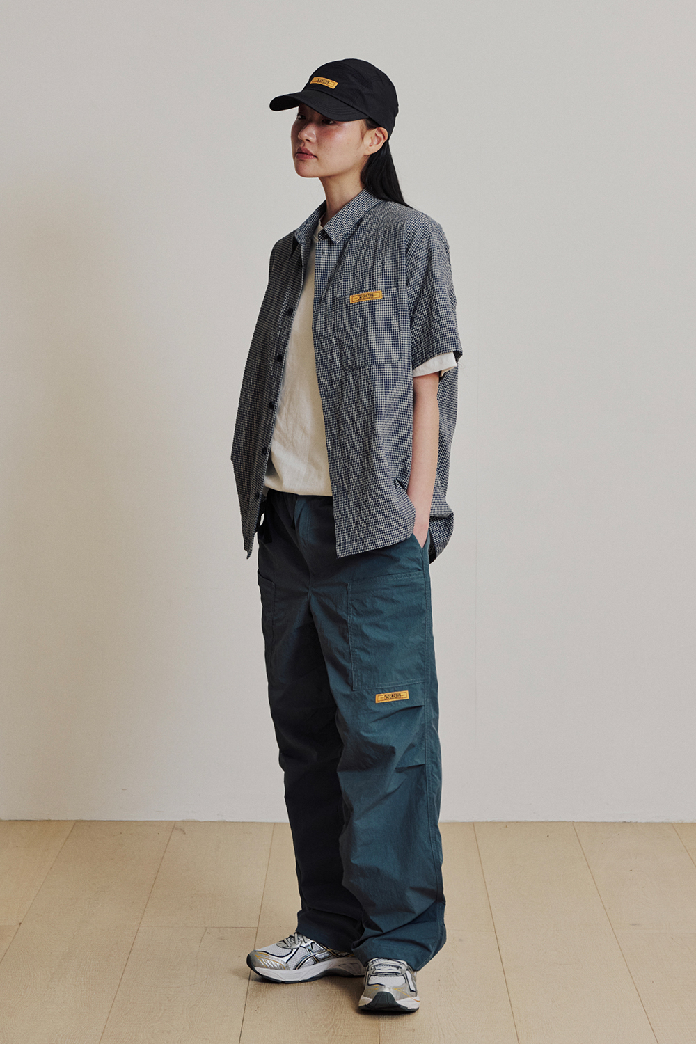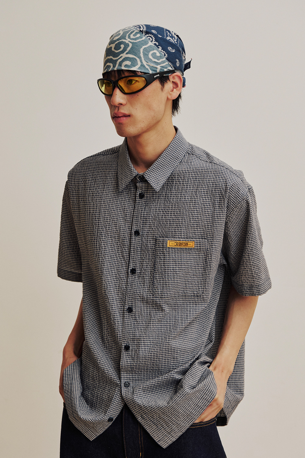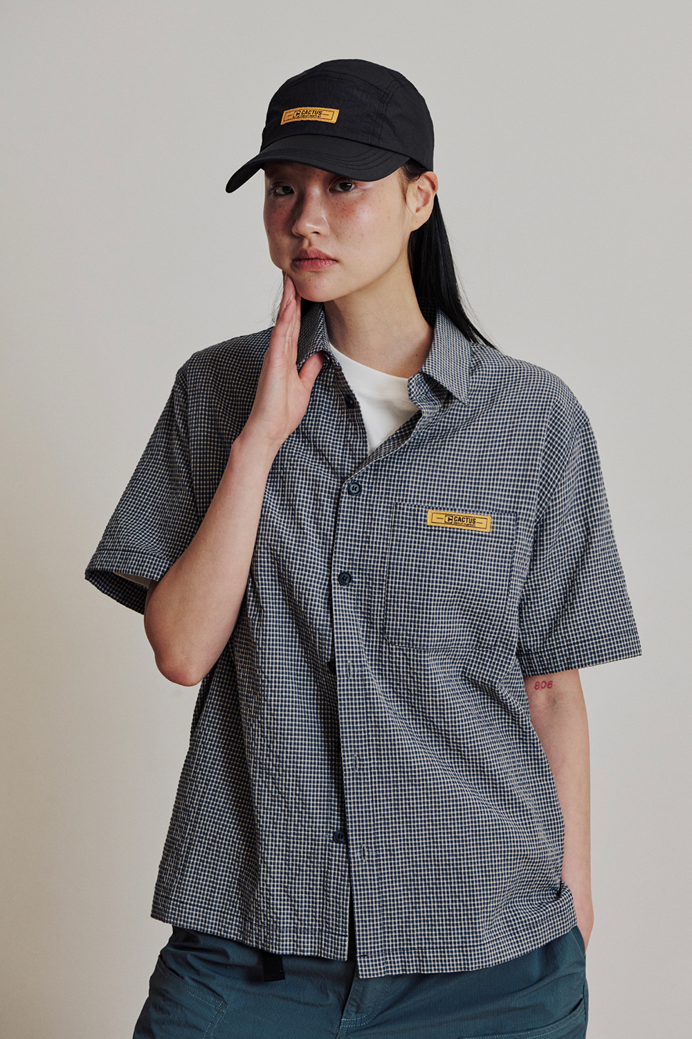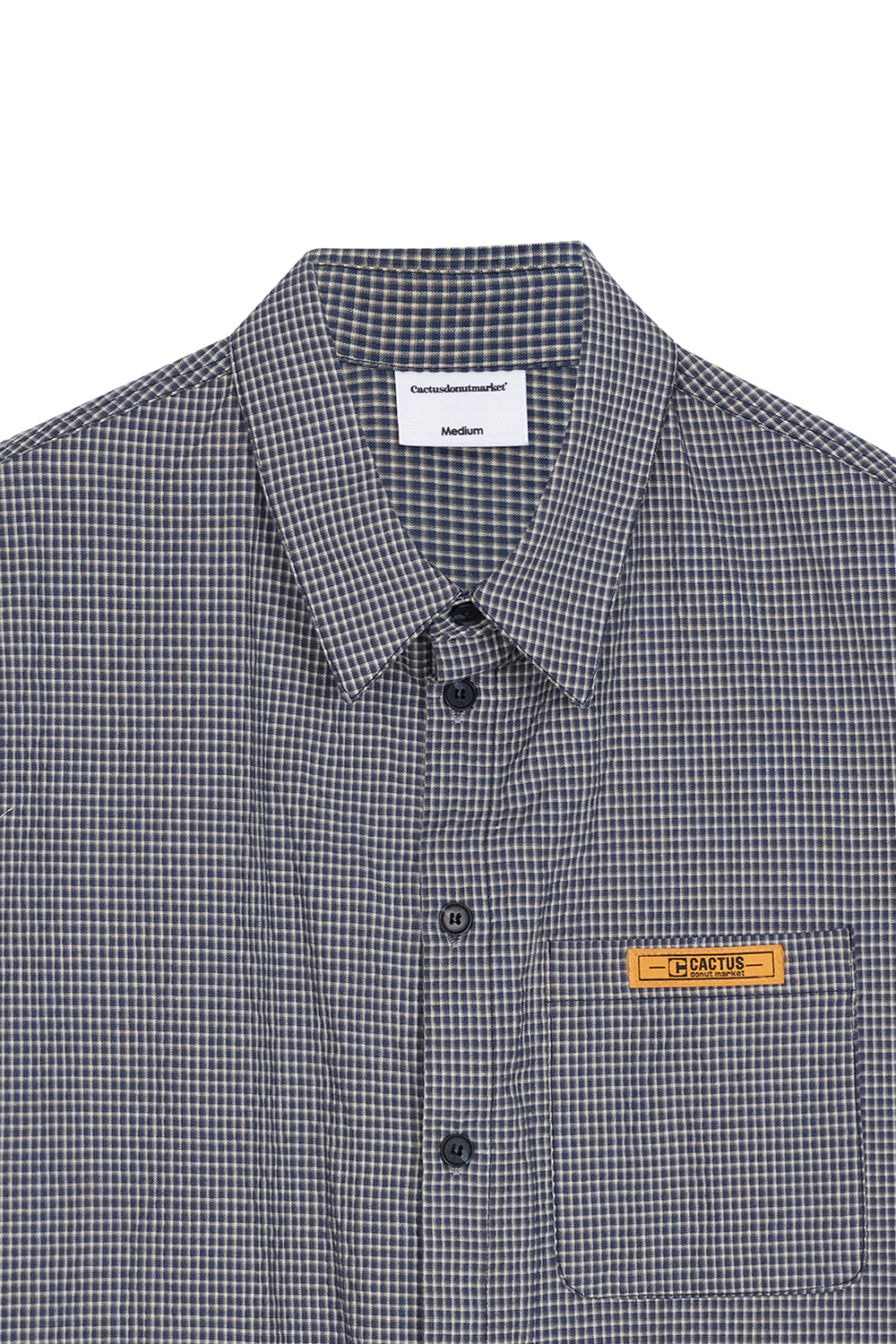 캑터스도넛마켓 미니 라벨 체크 하프 셔츠 – 블루
