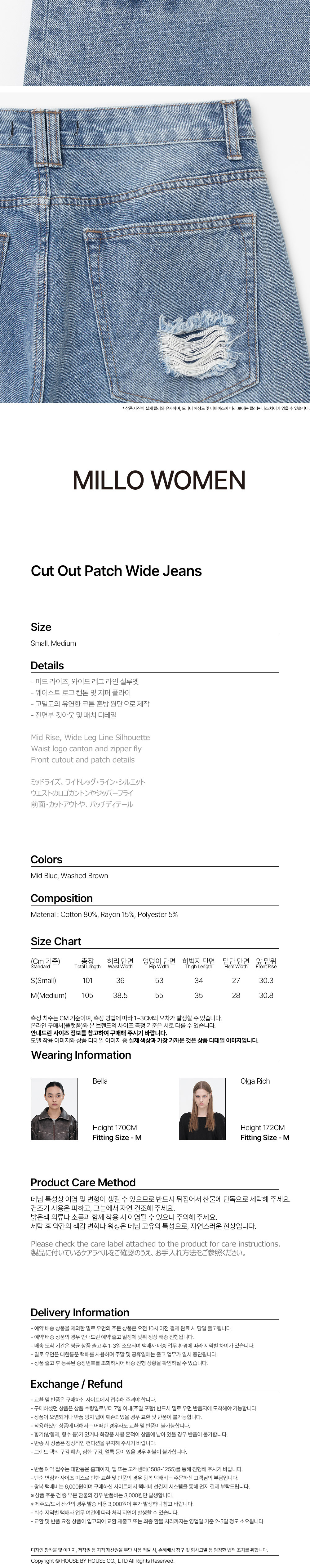 밀로 우먼 컷아웃 패치 와이드 진 미드 블루