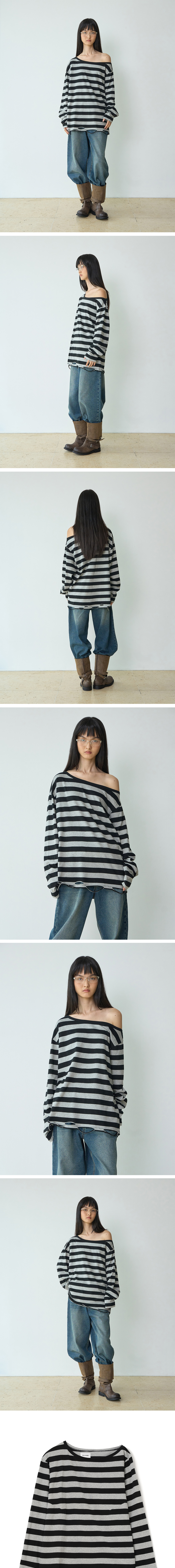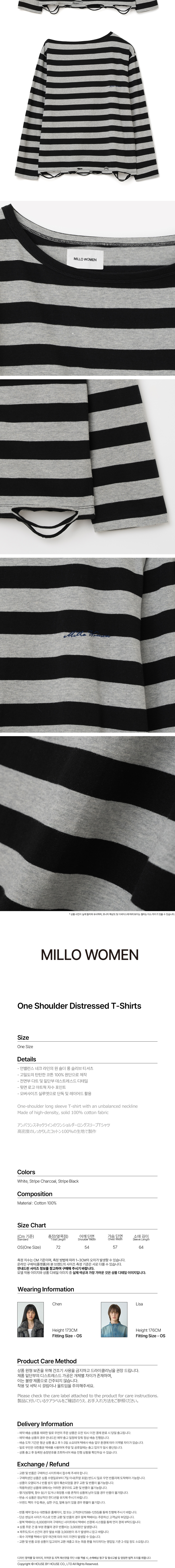 밀로 우먼 원 숄더 디스트레스드 티셔츠 스트라이프 블랙