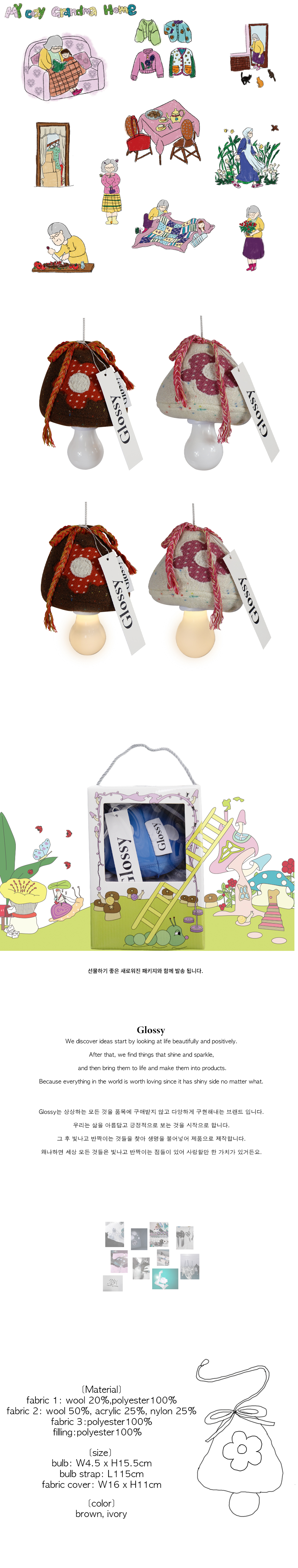 할머니의 폭닥한 니트를 닮은 머쉬룸 램프 aaa 건전지를 3개 넣어 사용하며 건전지 미포함 상품입니다. 원하는 위치에 간편하게 설치가능하고 줄을 잡아당겨 조명을 킬 수 있습니다. 잘 자란 버섯 수확해 가세요!🍄 램프 크기: 4.5cm*15.5cm, 끈 길이: 115cm 버섯 크기: 16*11cm 전구: pp, abs(건전지 미포함) 원단: 울 20%, 폴리에스테르 80% 배색 1: 울 50%, 아크릴 25% 나일론 25% 배색 2: 폴리에스테르 100% 충전재 폴리에스테르 100% * 제품과 함께 동봉되는 사용법 카드를 꼭 참조해 사용해주시고, 세탁 해주세요.