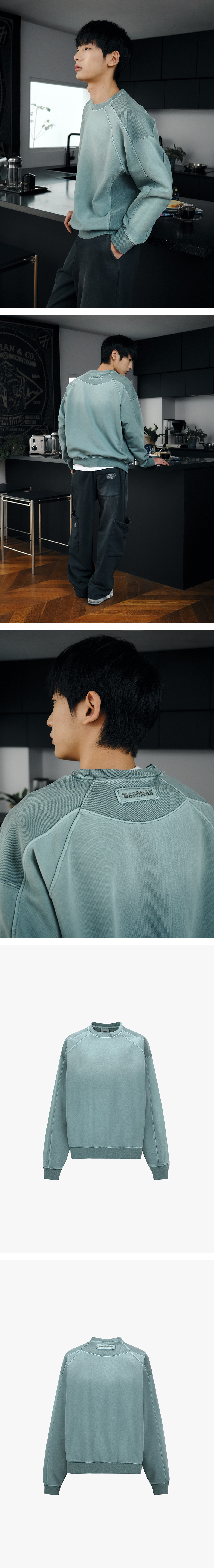 -레귤러 핏의 크루넥 스웻셔츠 - 제품 뒷면 및 하단 woodman 로고 디테일 -빈티지 가공 처리로 유니크한 컬러감 연출