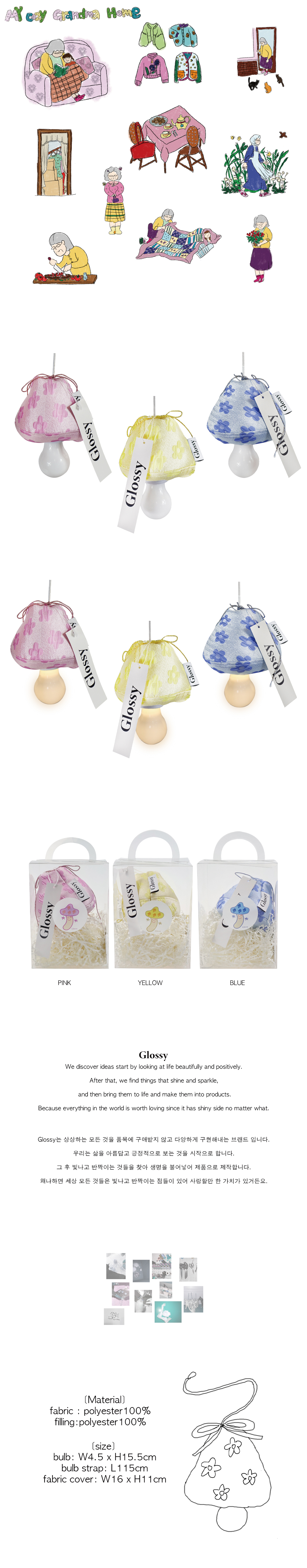 반짝이는 할머니의 꽃 핀을 닮은 머쉬룸 램프 aaa 건전지를 3개 넣어 사용하며 건전지 미포함 상품입니다. 원하는 위치에 간편하게 설치가능하고 줄을 잡아당겨 조명을 킬 수 있습니다. 잘 자란 버섯 수확해 가세요!🍄 램프 크기: 4.5cm*15.5cm, 끈 길이: 115cm 버섯 크기: 16*11cm 전구: pp, abs(건전지 미포함) 원단: 폴리에스테르 100% 충전재: 폴리에스테르 100% * 제품과 함께 동봉되는 사용법 카드를 꼭 참조해 사용해주시고, 세탁 해주세요.