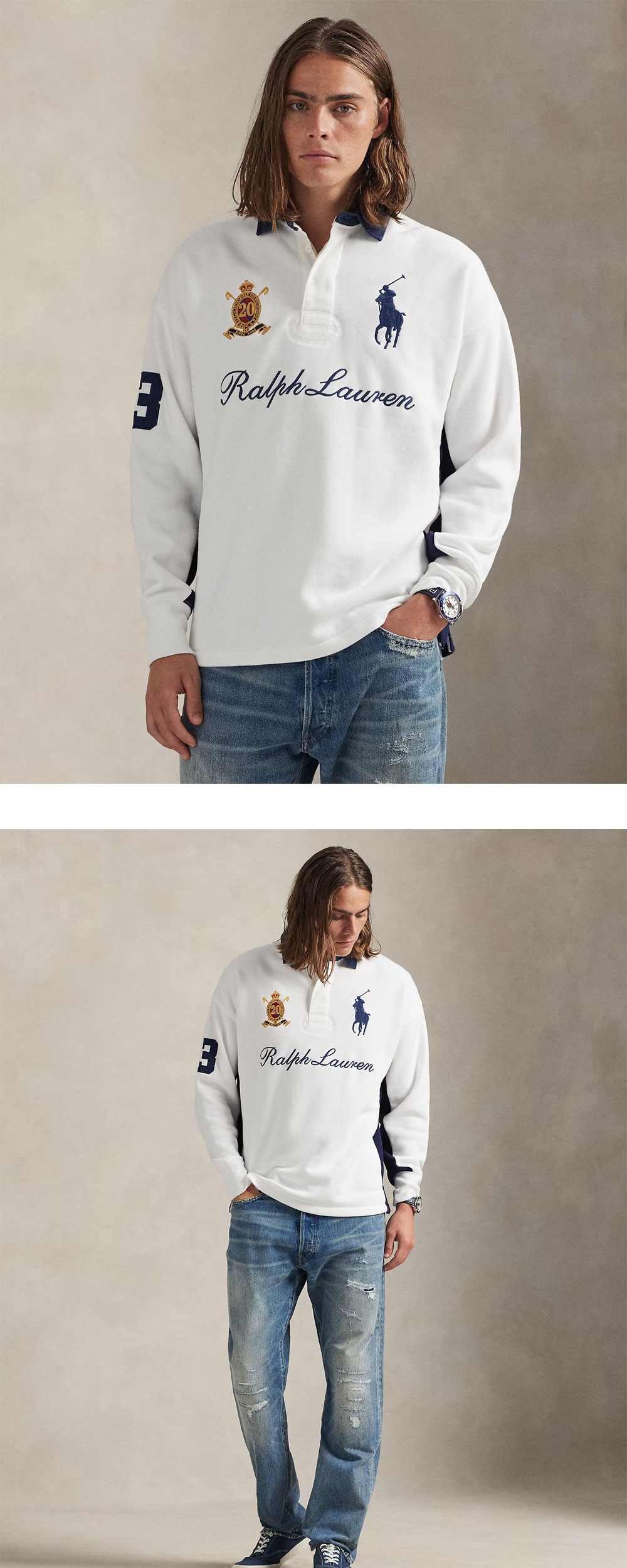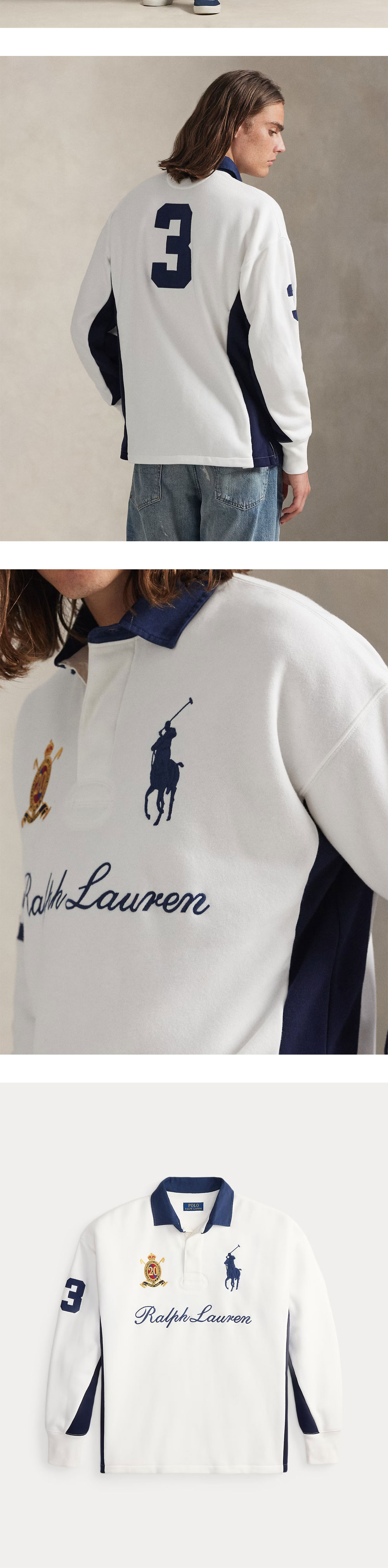 < KREAM은 랄프로렌 코리아 공식 파트너사로 모든 상품은 랄프로렌 코리아(유)에서 공급받은 정식 수입 제품입니다 > 폴로 랄프 로렌 빅 포니 20주년 기념 스웨트셔츠 화이트입니다. - 빅 포니 20주년 기념 크레스트 자수와 클래식한 럭비 디테일 - 배색 트윌 칼라와 고무 버튼을 더한 럭비 셔츠 스타일 - 소매와 뒷면의 숫자 '3' 트윌 패치 및 전면 자수 포인트 * 모델 정보: 신장 185cm M 사이즈 착용