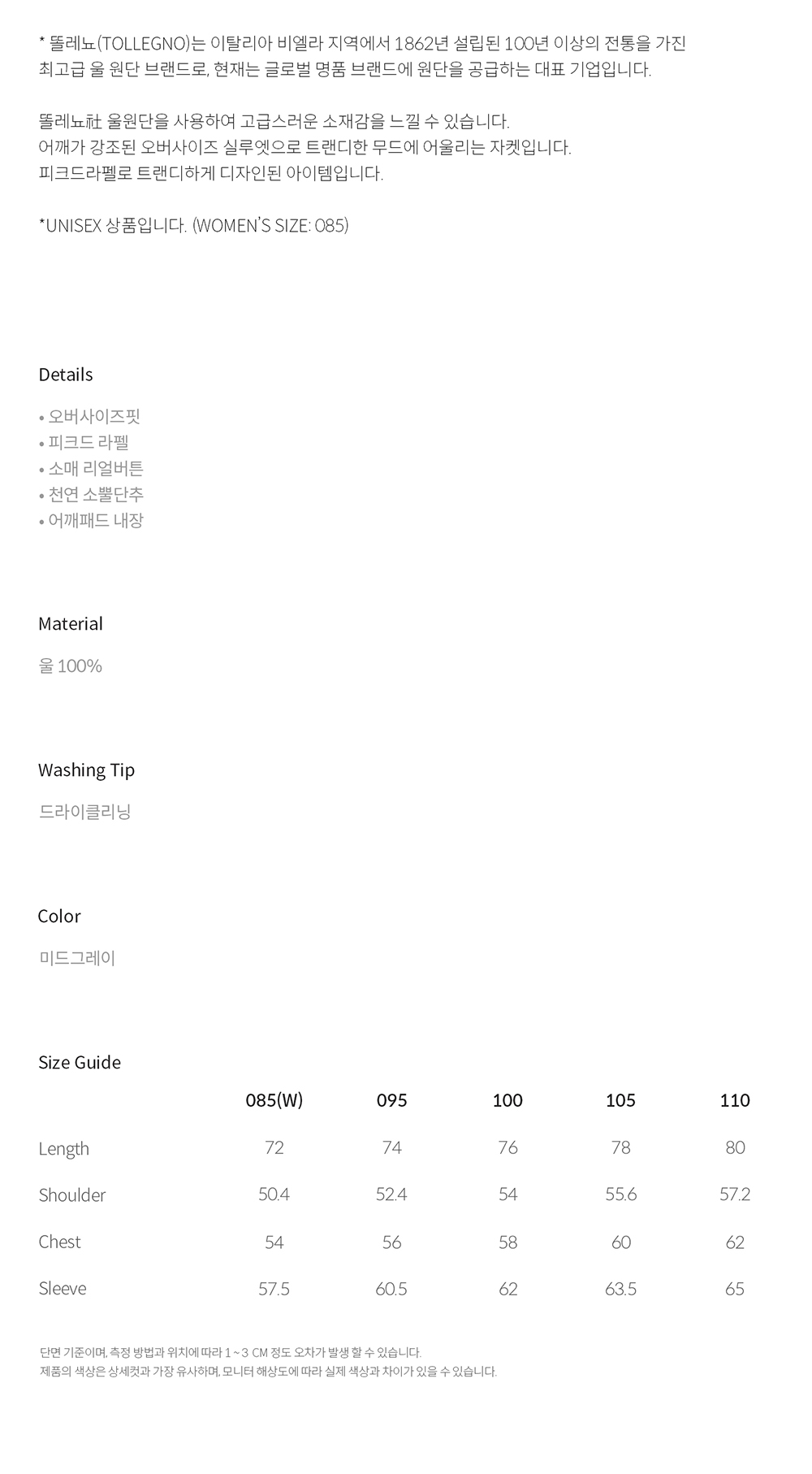 티엔지티 우먼 똘레노 스트럭처 울 자켓 미드그레이