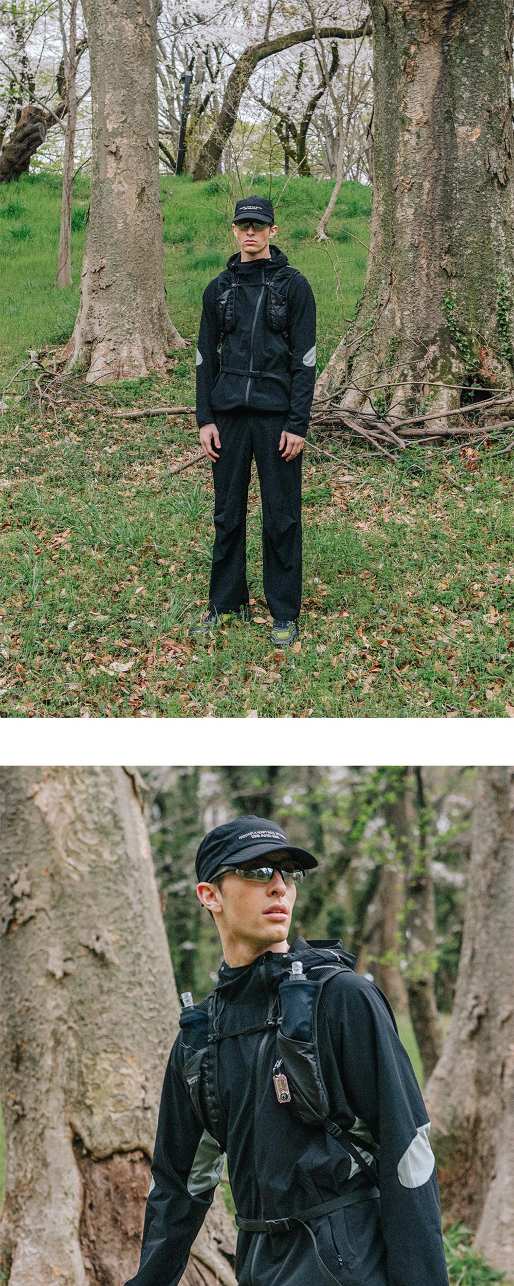 Shell Nylon 90% Spandex 10% 2-way stretch fabric Waterproof zipper Ventilated color-block panel at side Zippered slit at hem Adjustable waist with buckle Contrast stitch collar with curved cutlines Utility pocket at lower back waist Semi auto-lock zipper Logo print Standard silhouette Machine wash, separately Do not dry clean Do not tumble dry Do not use bleach