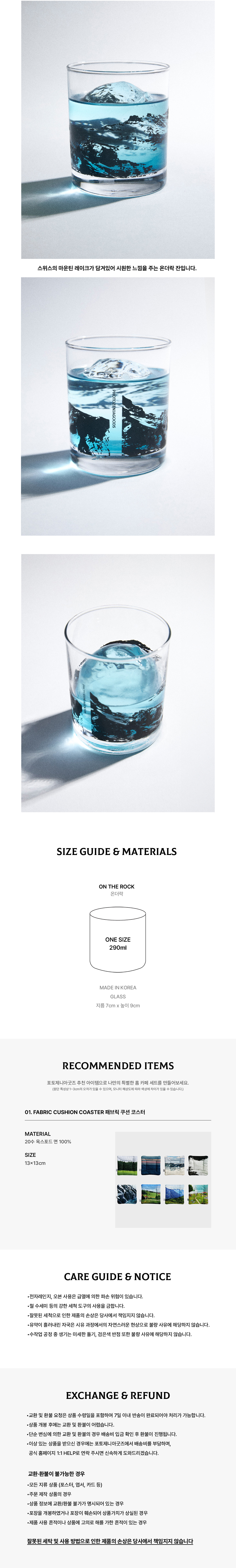 직접 촬영한 스위스 마운틴이 프린팅된 290ml의 용량 유리컵입니다. 위스키와 같은 주류 음용하기에 적절하며 아이스 음료, 커피 등 다양하게 활용할 수 있습니다. 크고 묵직하며 음료가 담겼을 때 제 멋을 발휘하는 온더락 유리잔입니다.