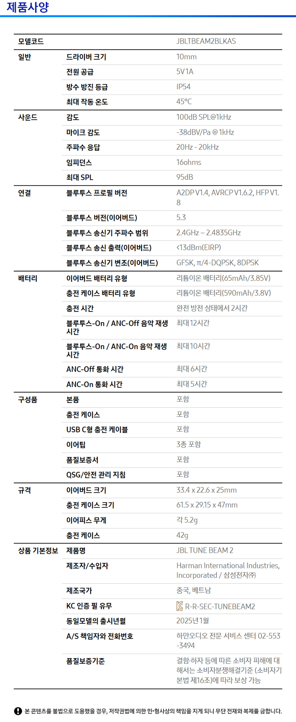 제이비엘 TUNE BEAM2 노이즈캔슬링 무선 블루투스이어폰