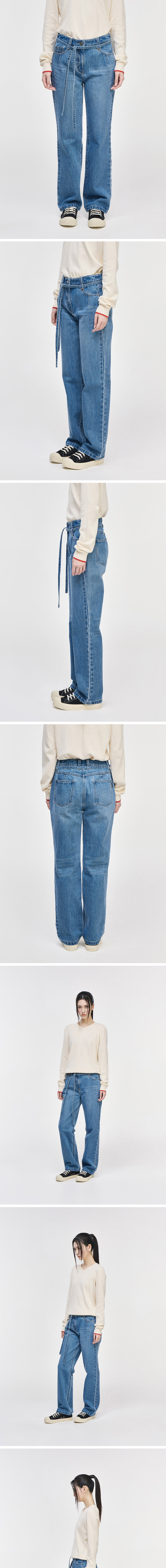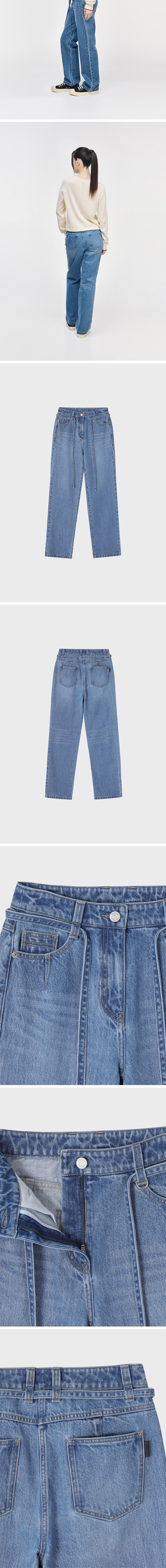 - 시그니처 스트레이트 데님 - 부드러운 터치감의 데님 패브릭 - 전면 시그니처 다트 디자인 - 제원단 벨트 구성 - 스트레이트 핏의 롱한 실루엣 - 총 4개의 포켓 구성 - 후면 송지오 레더장식 디테일
