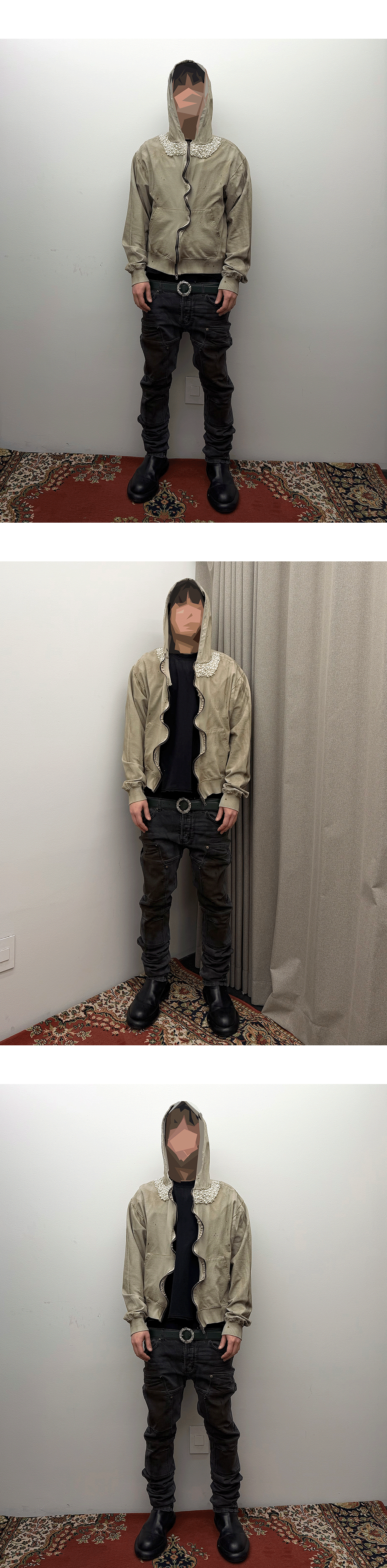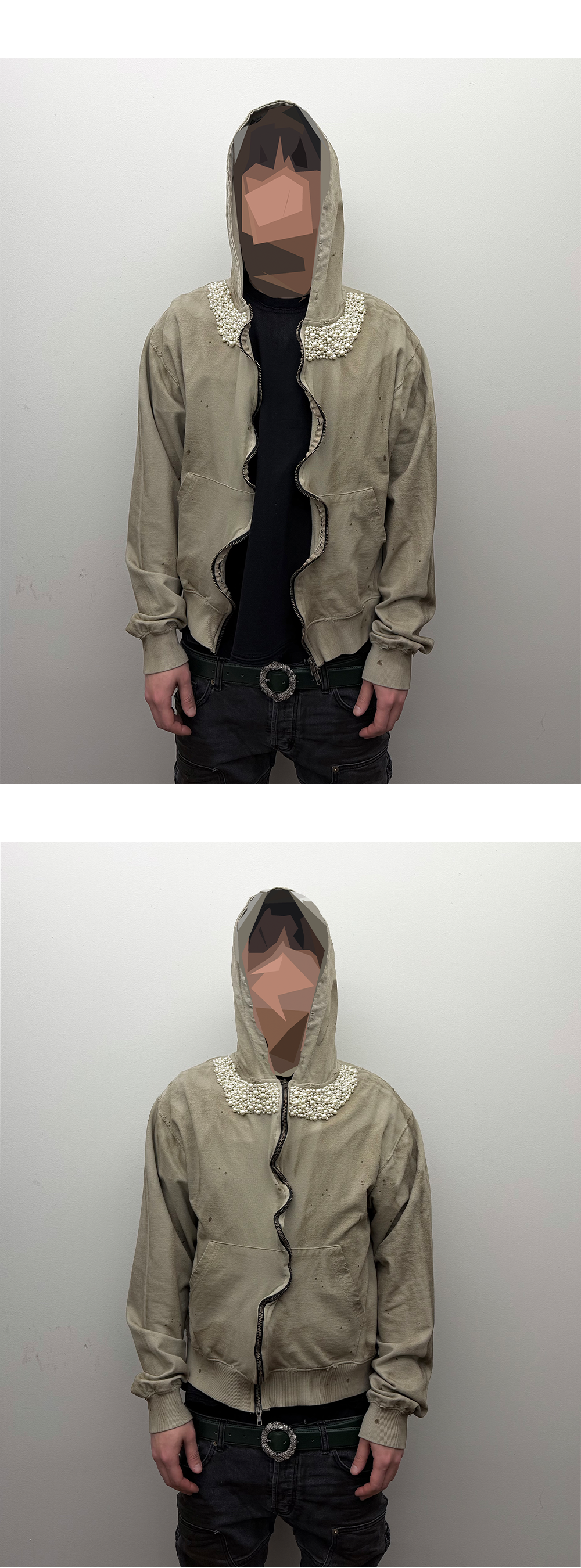빈티지 가공 실루엣에 넥 라인 진주 디테일을 더해 감각적인 대비를 연출한 후드 집업입니다. Model spec - 178cm / 70kg - Size 2 착용