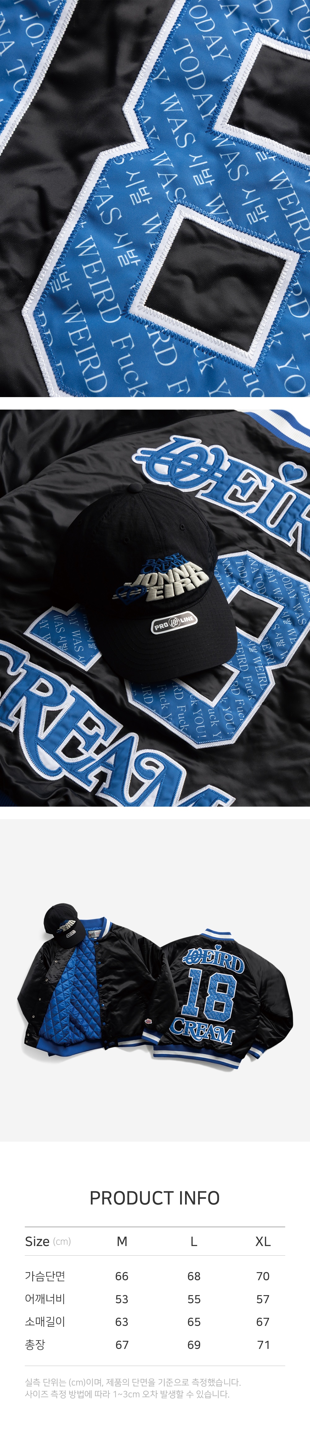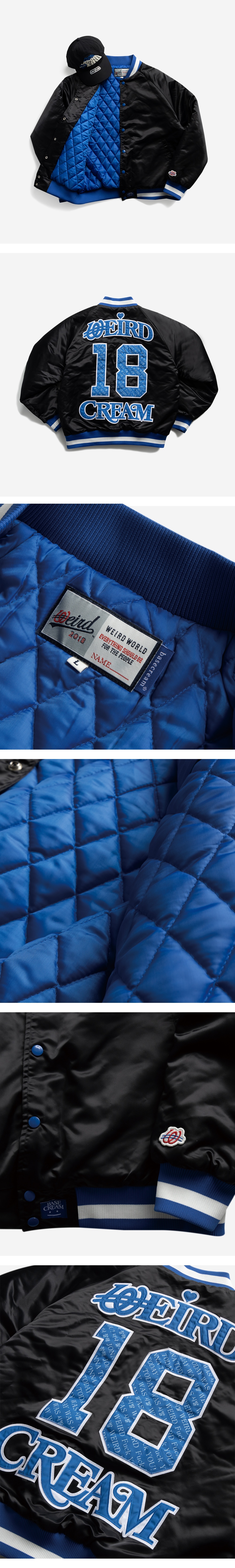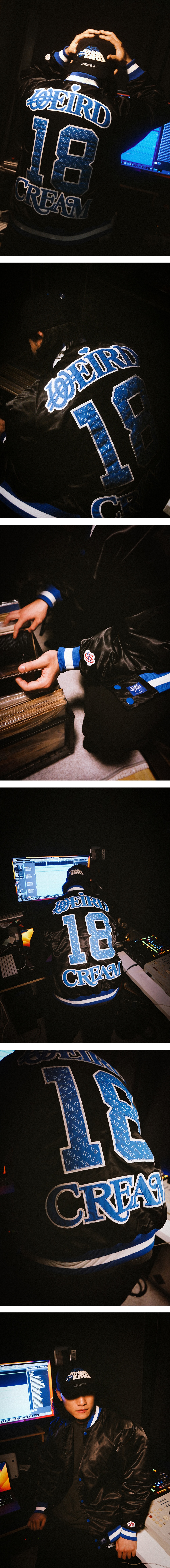 90년대 초반 미국 기반의 오리지널 사틴 바시티 재킷의 쉐입을 모티브로, 원단까지 복각한 사틴 바시티 재킷을 발매합니다. 베이스크림의 ‘너잘시’와 위얼드월드의 TODAY WAS JONNA WEIRD를 패턴화한 그래픽, 그리고 아플리케 자수 디테일로 완성도를 높였습니다.