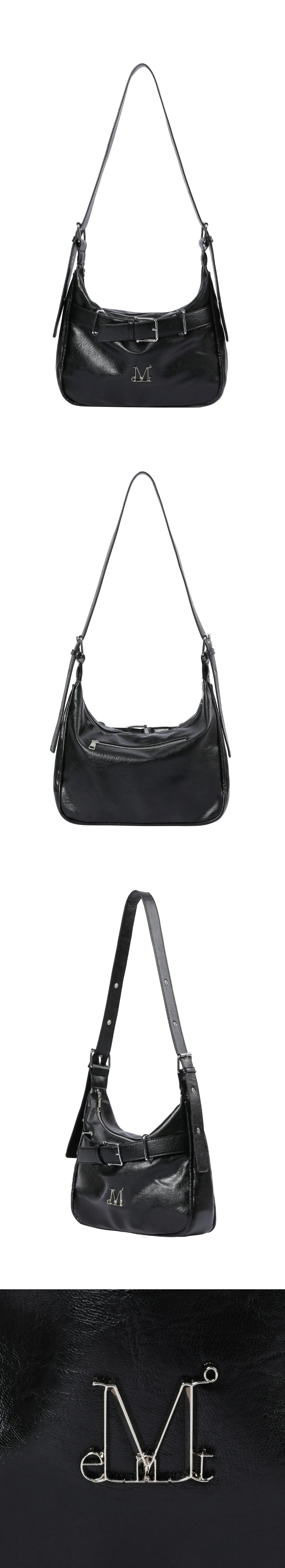 무센트 모닉 메탈 로고 프론트 벨티드 레더 숄더백 남녀공용 블랙