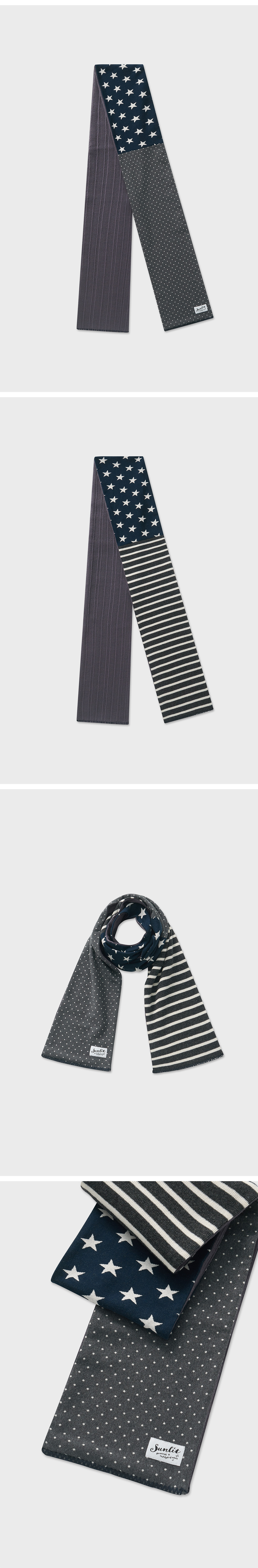 - 스타, 도트, 스트라이프 3가지 패턴 믹스 디자인 - 부드럽고 신축성 있는 다이마루 원단 사용 - 가볍고 따뜻한 착용감 - 썬릿 메인 라벨 포인트 - 캐주얼하면서도 개성 있는 스타일 연출 가능 - Made In China Model Size 아야네(단발)/ 혜빈(긴헤어) 155CM 높이 213 폭 20 ※ 제품 측정 방법에 따라 ±1~2cm 오차가 있을 수 있습니다. Fabric <Gray, Blue> Shell 1 Cotton 94% Span 6% Shell2 Cotton 88% Polyester 8% Span 4% Shell3 Cotton 95% Span 5% Shell4 Polyester 95% Span 5% <Navy, Black> Shell1 Cotton 94% Span 6% Shell2 Cotton 88% Polyester 8% Span 4% Shell3 Wool 16% Polyester 67% Cotton 13% Nylon 3% Acrylic 1% Shell4 Polyester 95% Span 5%"