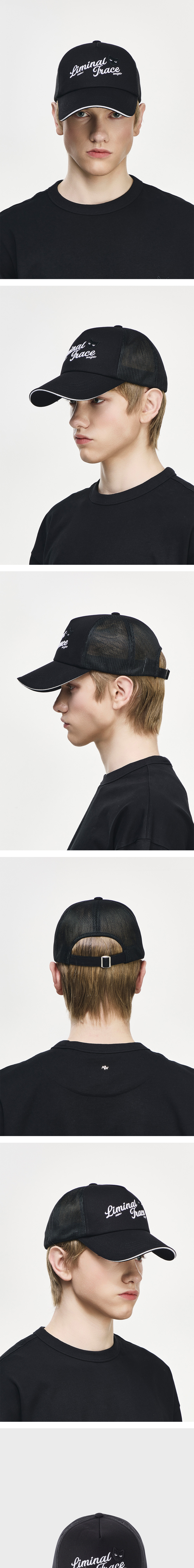 - ZZERO 리미널 트레이스 트러커 볼캡 - 탄탄한 코튼 패브릭 - 전면 '그레이 아이즈' 러브 펜서 와펜 - 전면 '리미널 트레이스' 엠브로이드 - 배색 포인트 - 후면 스트랩 버클로 머리둘레 조정 가능 FABRICATION MADE IN KOREA STYLE CODE SI2CP805BK