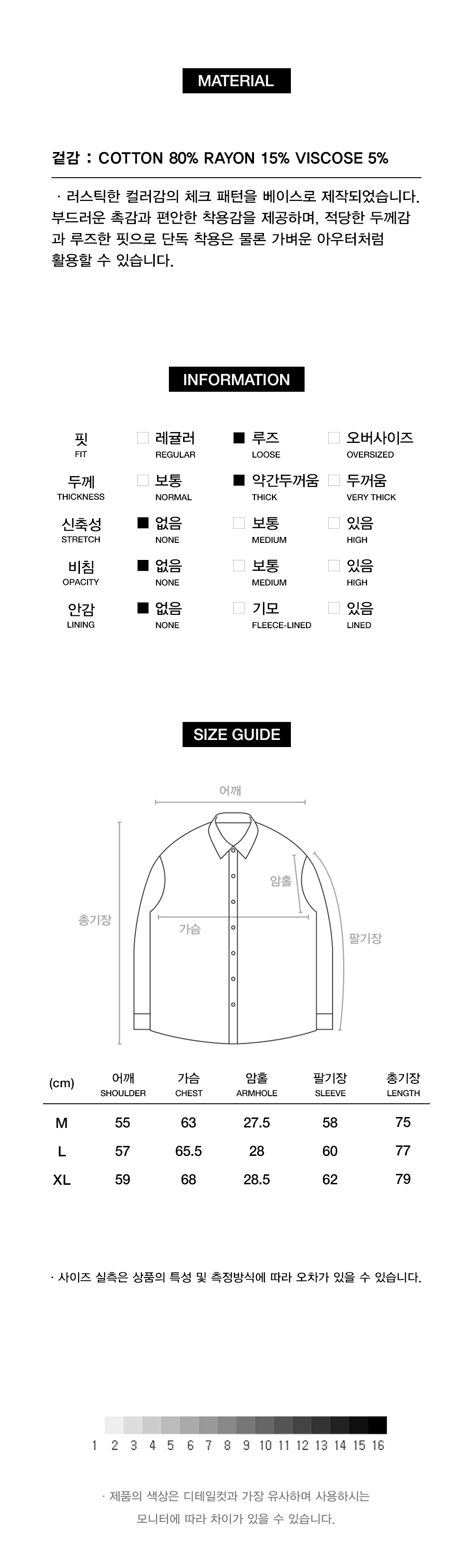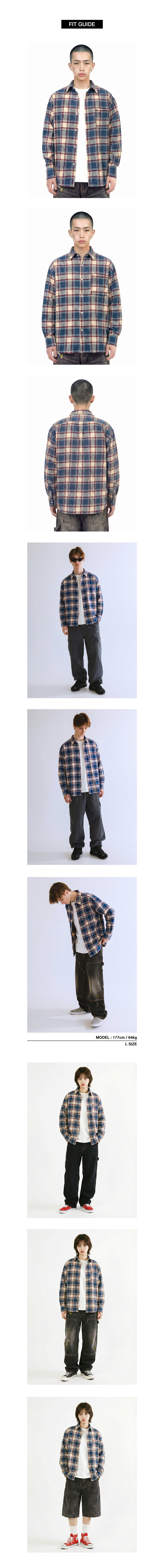 러스틱한 컬러감의 체크 패턴을 베이스로 제작되었습니다. 부드러운 촉감과 편안한 착용감을 제공하며, 적당한 두께감 과 루즈한 핏으로 단독 착용은 물론 가벼운 아우터처럼 활용할 수 있습니다.