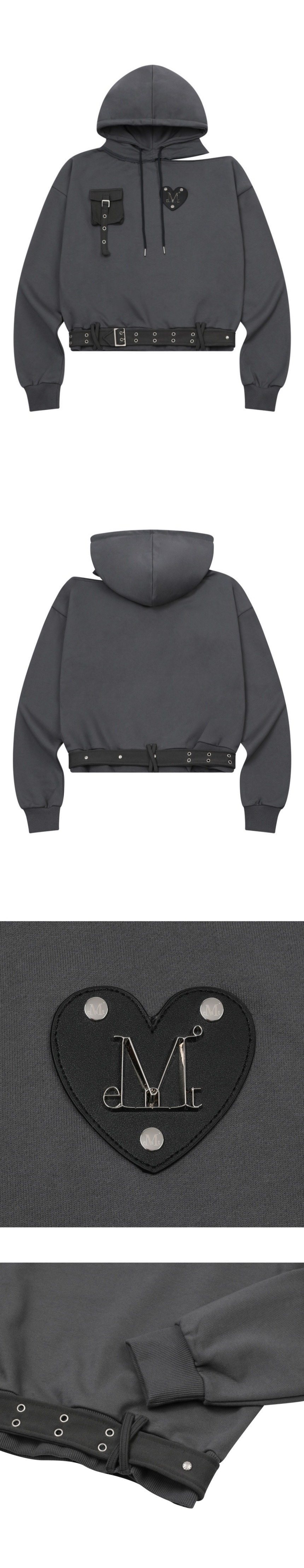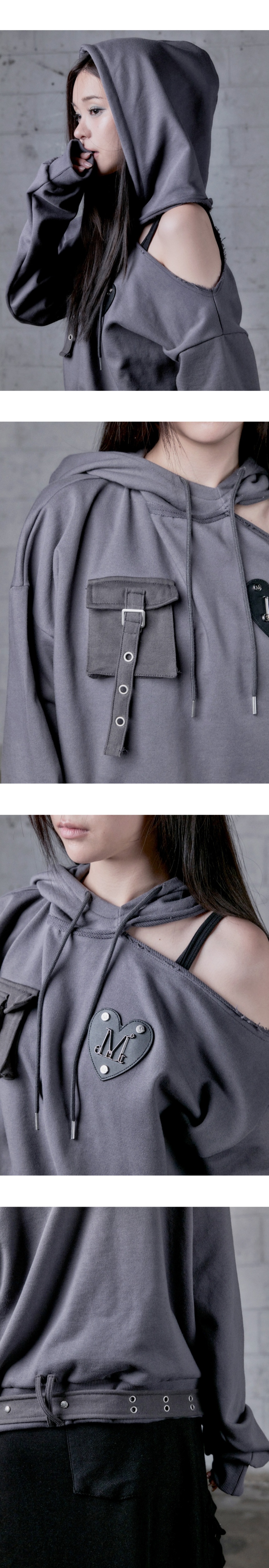 ┃Detail • 전면부 무센트 메탈 로고 하트 패치 포인트 • 밑단 벨트 스트랩으로 유니크한 디테일 • 전면부 사용 가능한 포켓으로 실용성 용이 • 원 숄더 포인트에 컷아웃 디자인으로 페미닌한 무드 • 후드 스트링 내장 • 소매, 밑단 밴딩 처리 • 코디에 포인트가 되는 유니크한 아이템 ┃Material : Cotton 55%, Polyester 45% ┃Care : Dry cleaning - 무센트는 말기의 행성인 이 지구에서 지속 가능한 옷들을 고민합니다. 우리는 신념을 소비하는 미닝아웃을 지지합니다.