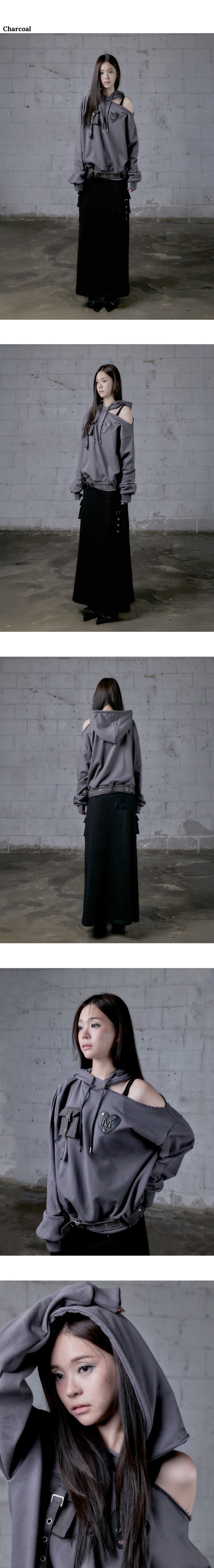 무센트 카엔 메탈 로고 컷아웃 원 숄더 후드 티 차콜