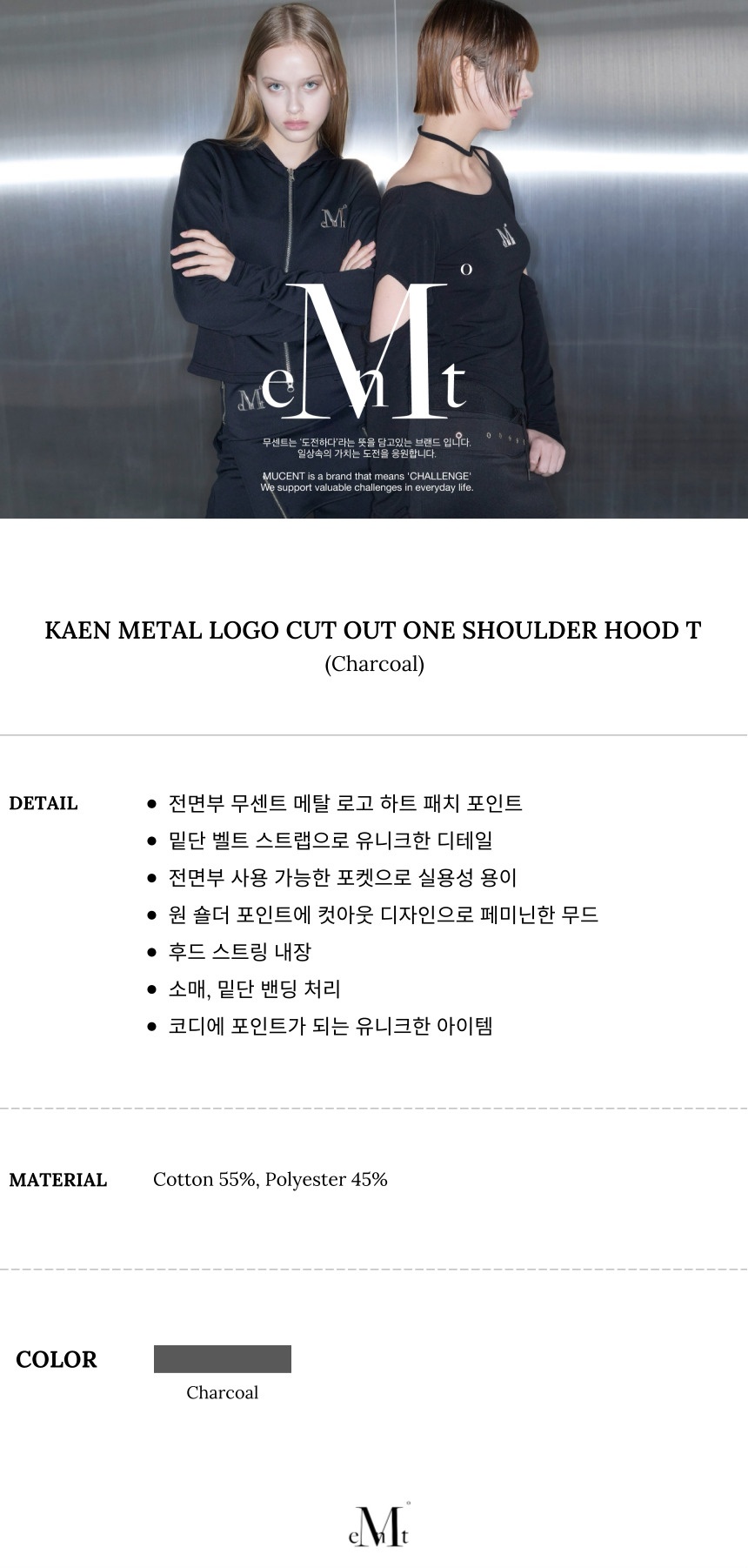 MUCENT Kaen Metal Logo Cut Out One Shoulder Hood T Charcoal
