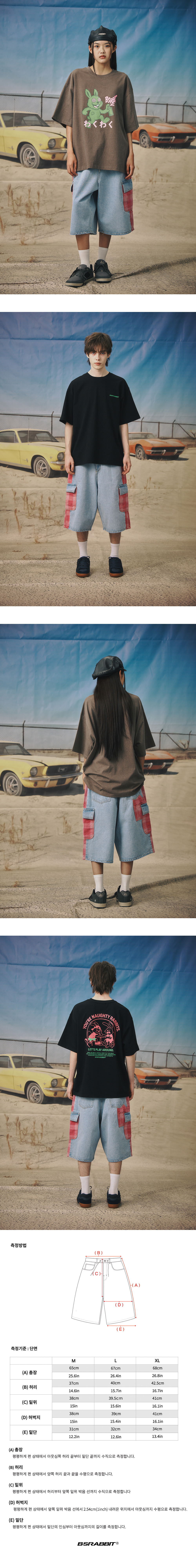 비에스래빗 카펜터 루즈핏 카고 데님 숏팬츠 체크믹스 라이트 블루