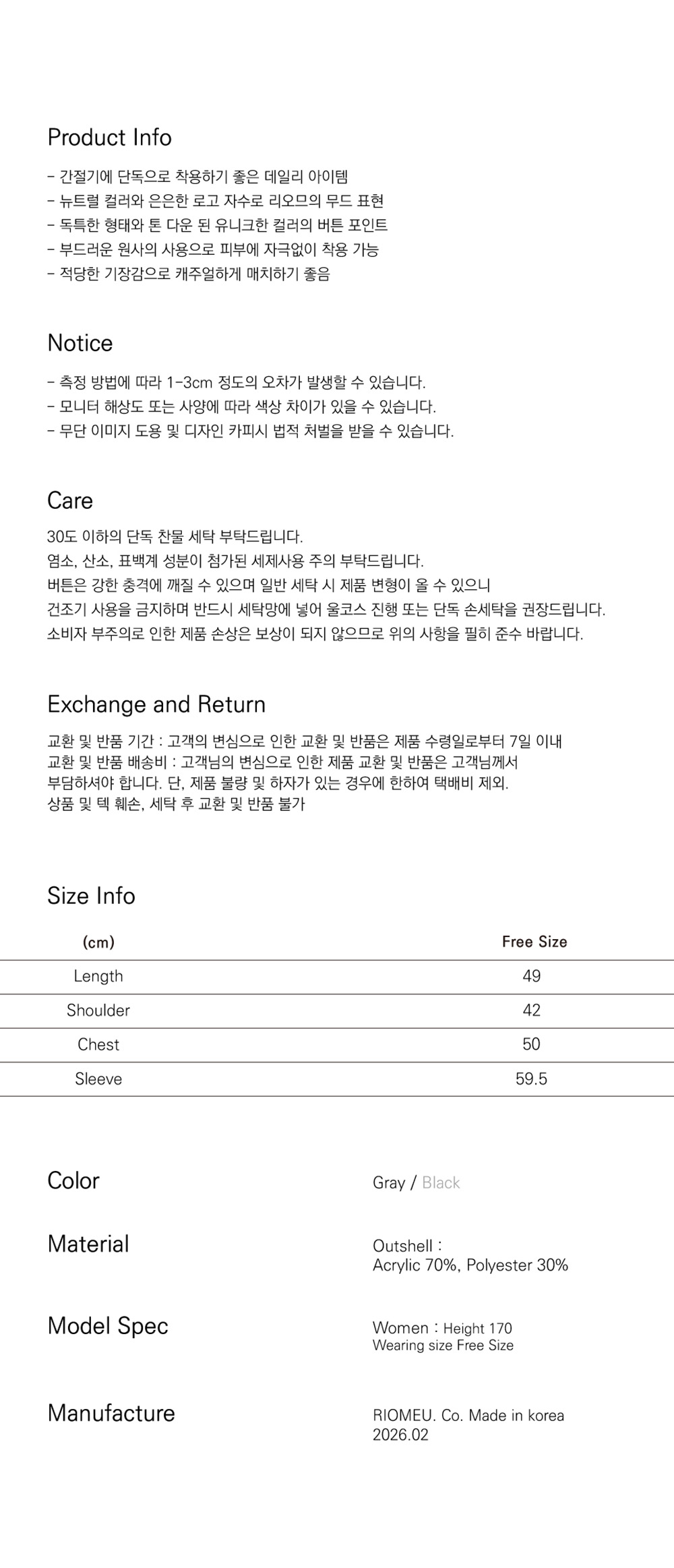 리오므 스텔라 버튼 니트 가디건 그레이