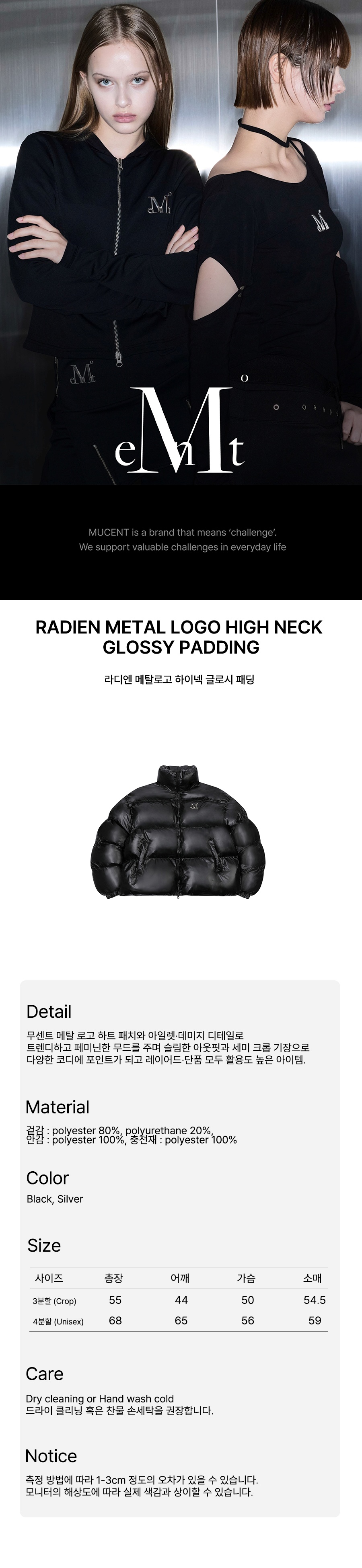 ┃Detail • 전면, 후면 무센트 시그니처 메탈 로고 포인트 • 다양한 스타일링이 가능한 2WAY 지퍼 • 글로시한 원단으로 유니크한 무드 • 크롭한 기장감의 하이넥 패딩 • 밑단 스트링으로 두가지 핏 연출 가능 • 바람 유입을 줄여주는 밑단, 소매 밴딩 디자인 • 하이넥 디자인으로 높은 보온성 ┃Material : 겉감 - polyester 80%, polyurethane 20%, 안감 - polyester 100%, 충전재 - polyester 100 ┃Care : Dry cleaning