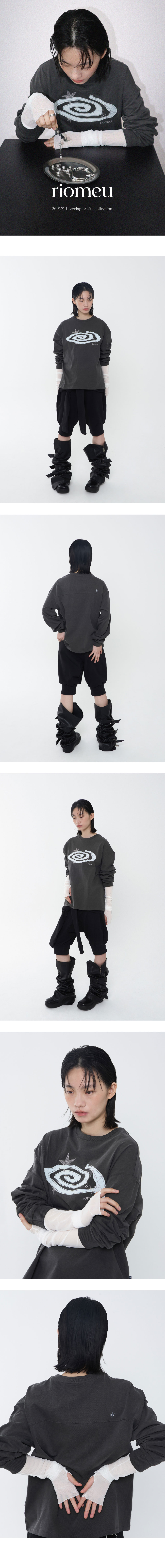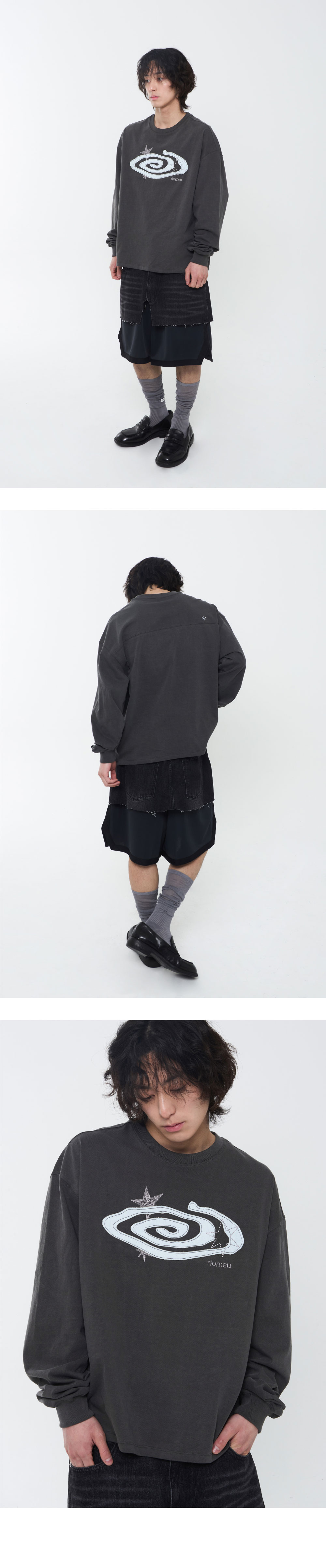 리오므 데님 아플리케 롱슬리브 티 차콜