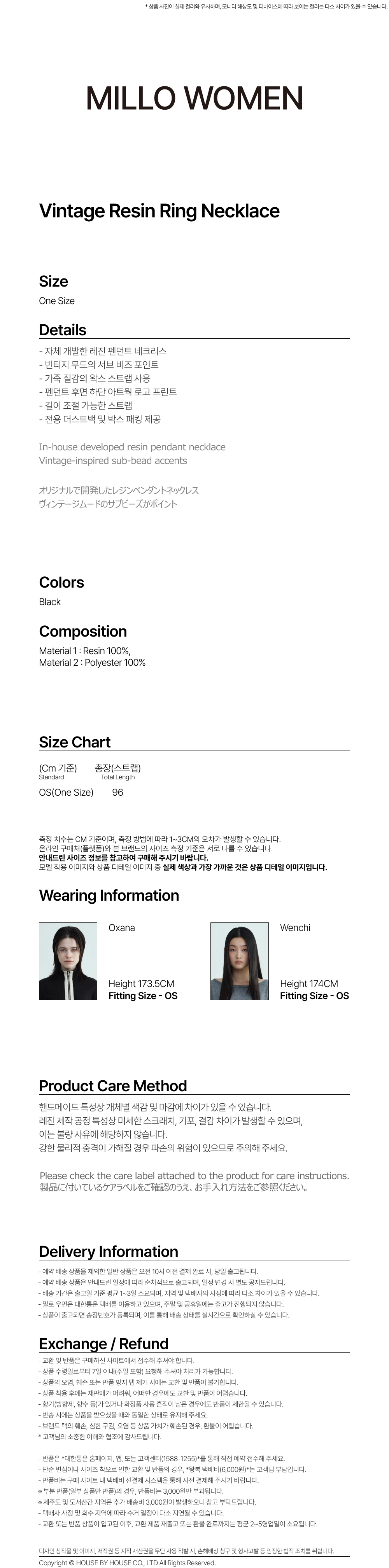 밀로 우먼 빈티지 레진 링 네크리스 블랙