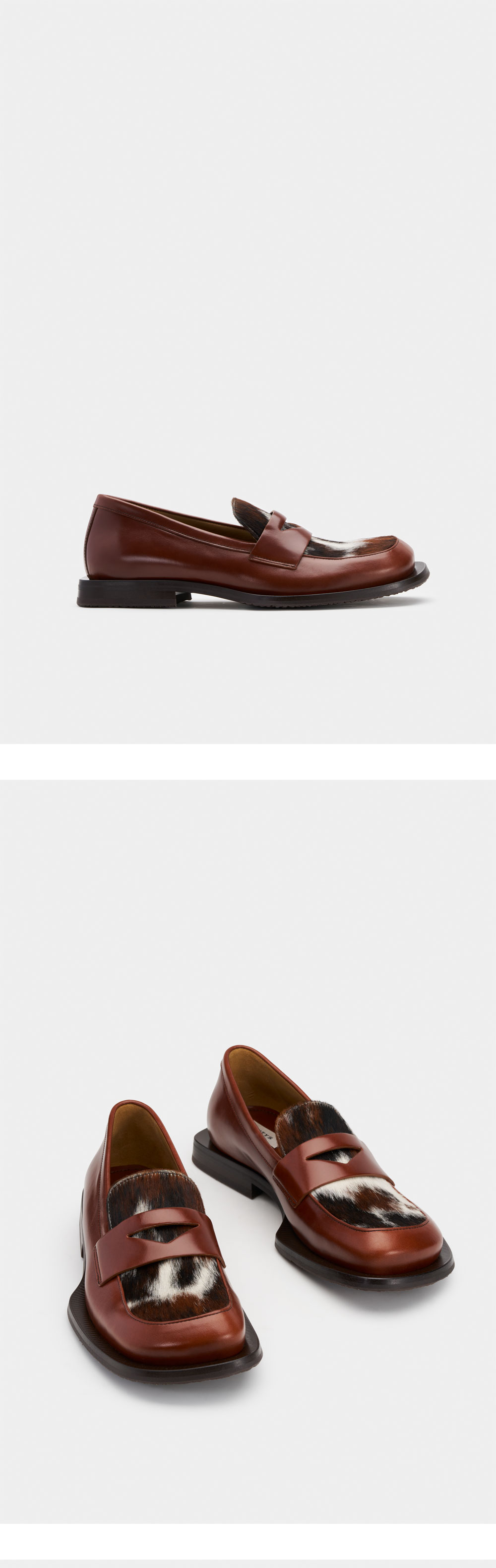 이티스 사반트 마호가니 카프 헤어 레더 브라운입니다. - 광택감이 있는 폴리시드 레더와 송아지 털 소재의 조합 - 아이비리그 스타일을 재해석한 유니크한 비대칭 앞코 디자인 - 유연함과 접지력을 모두 갖춘 핸드크래프트 고무창 적용 - 라텍스와 가죽 커버 인솔로 편안하고 풍부한 쿠셔닝 제공 - 2cm 굽 높이와 안정적인 스퀘어 힐 디테일 - 천연 소재 특성상 제품마다 패턴이 다른 고유의 희소성 - MADE IN PORTUGAL