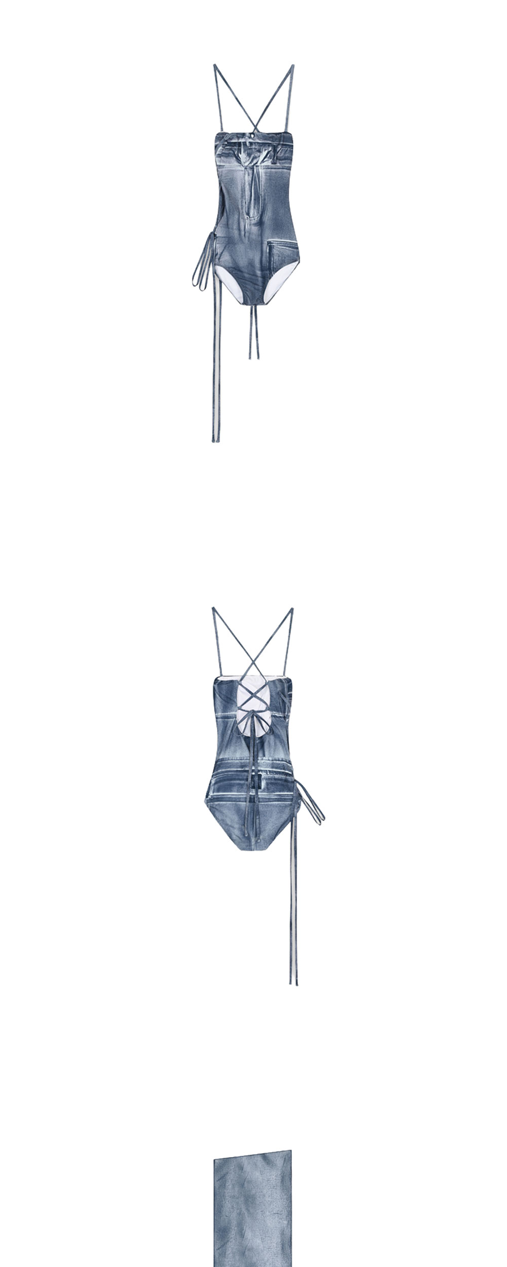 나체 우먼 데님 프린티드 스윔수트 블루 입니다. - 고해상도 데님 텍스처 프린팅의 신축성 있는 소재 - 슬림한 숄더 스트랩으로 가벼운 어깨 라인 연출 - 측면 롱 스트랩 타이 디테일 포인트