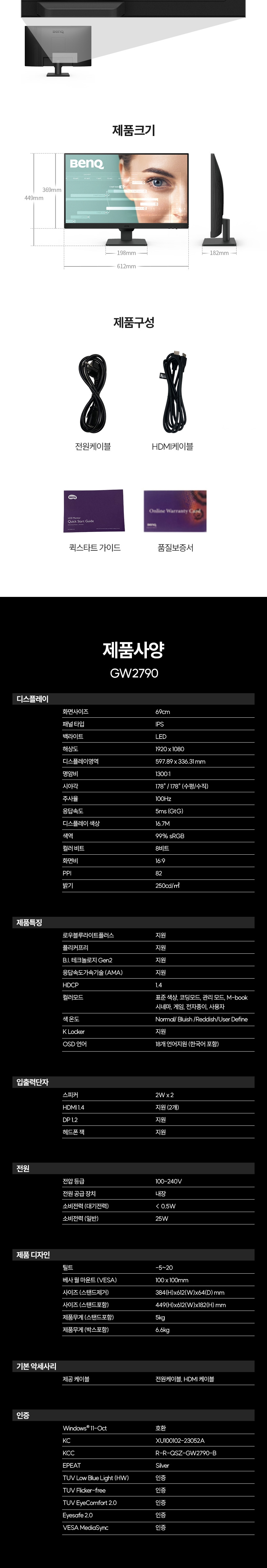 벤큐 GW2790 아이케어 무결점 사무용 가정용 모니터 IPS패널 100hz