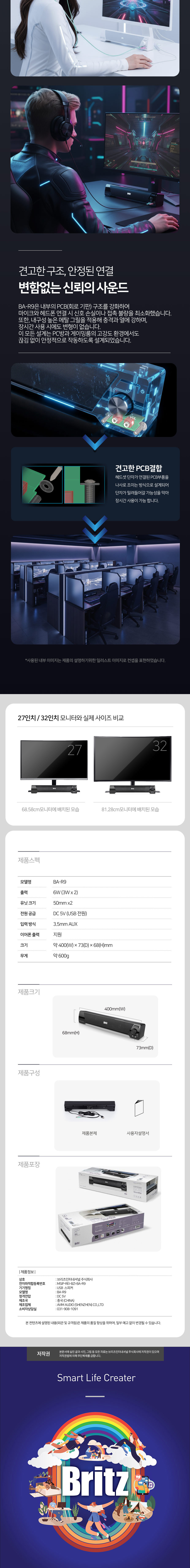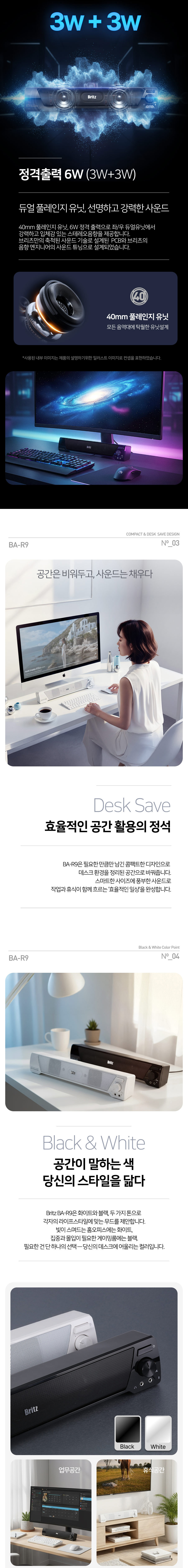 브리츠 BA-R9 컴퓨터 USB전원 데스크탑 2채널 사운드바 PC스피커 블랙