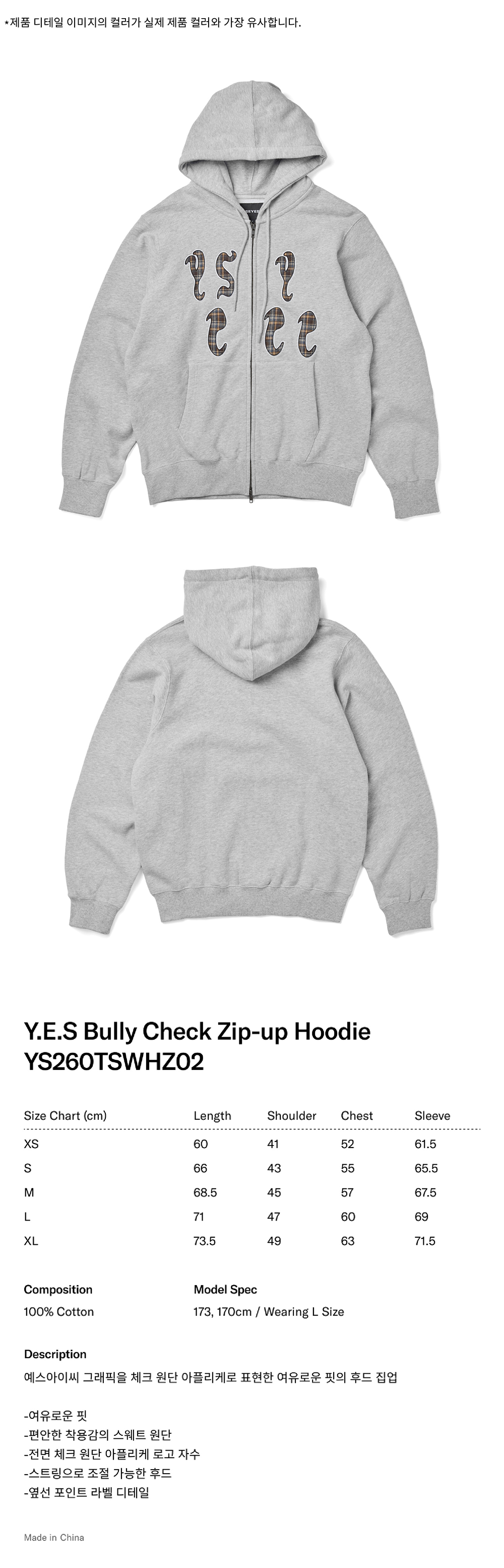 [더블적립] YESEYESEE Y.E.S Bully Check Zip-up Hoodie Grey