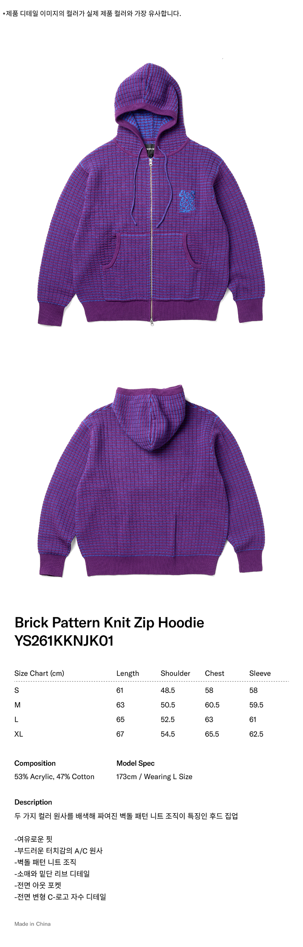 [더블적립] 예스아이씨 브릭 패턴 니트 집업 후디 퍼플