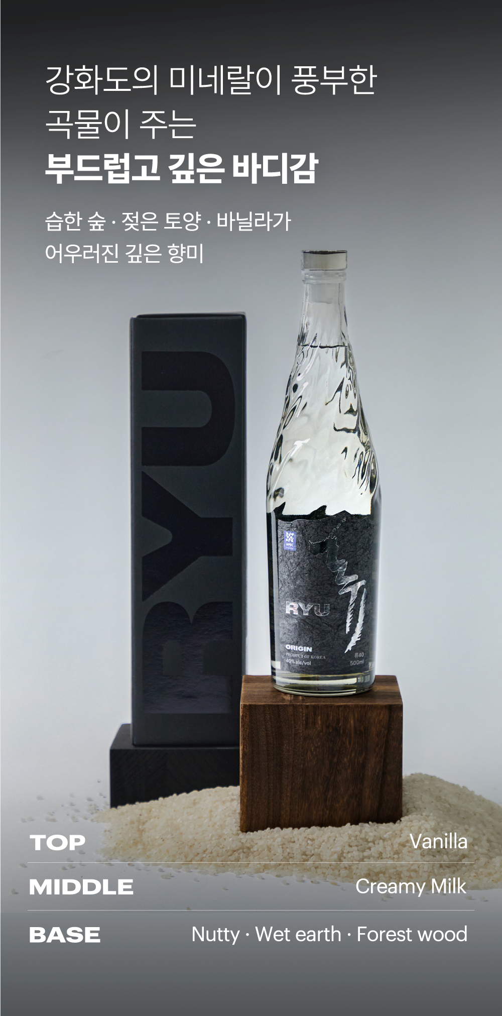시간이 물러난 자리에 깃든, 깊이 있는 무게감을 선사하는 한국 전통 소주로 고도수에서 오는 묵직한 바디감, 부드럽게 풀어내는 크리미한 여운과 은은하게 퍼지는 바닐라와 밀키한 향을 선보입니다.