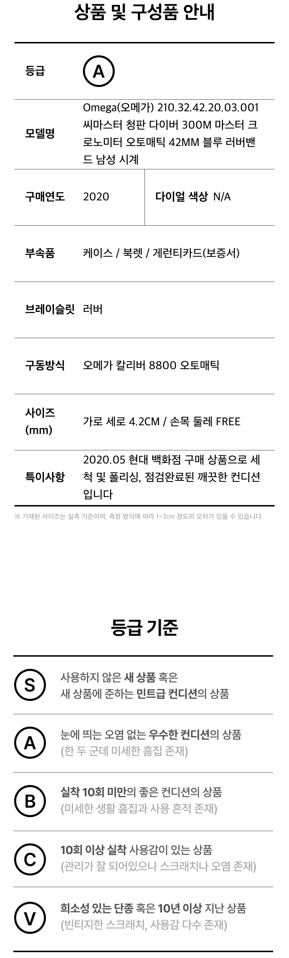 오메가 210.32.42.20.03.001 씨마스터 청판 다이버300M 마스터 크로노미터 오토매틱 42MM 블루 러버밴드 남성 시계aa57574