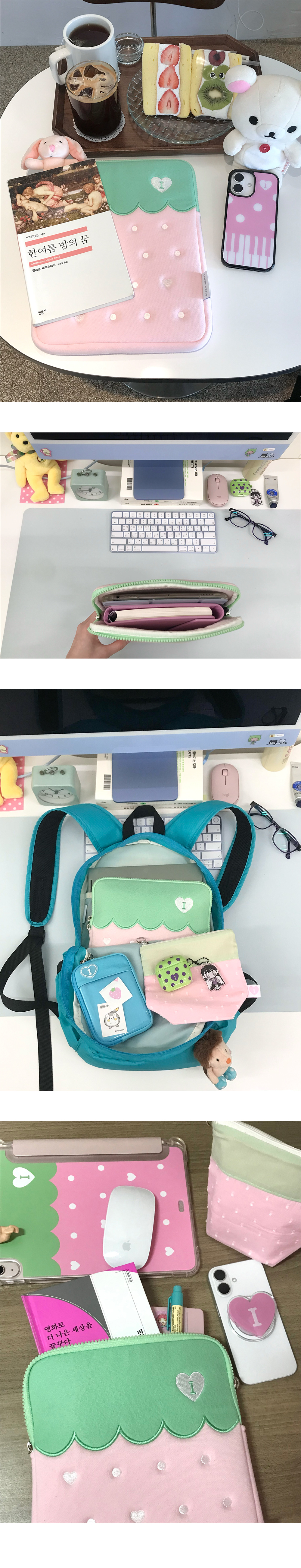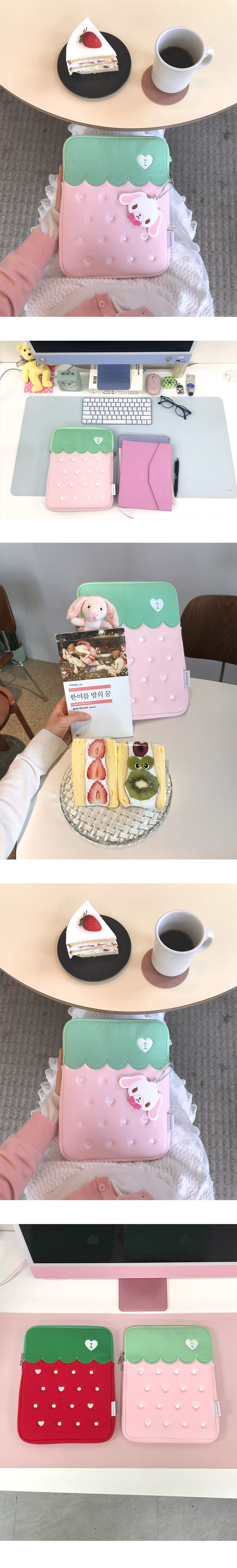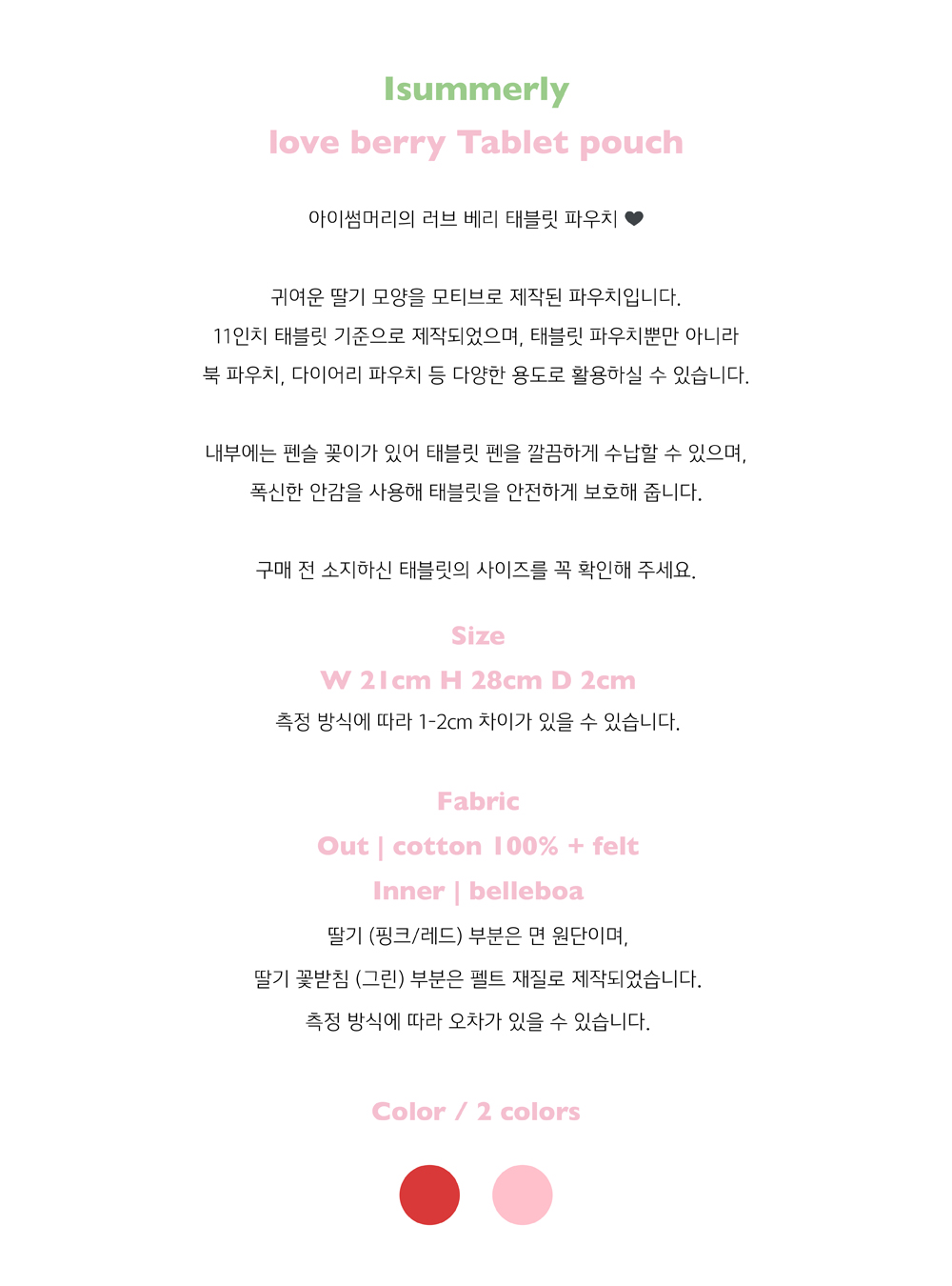 아이썸머리의 러브 베리 태블릿 파우치 ♥ 귀여운 딸기 모양을 모티브로 제작된 파우치입니다. 11인치 태블릿 기준으로 제작되었으며, 태블릿 파우치뿐만 아니라 북 파우치, 다이어리 파우치 등 다양한 용도로 활용하실 수 있습니다.