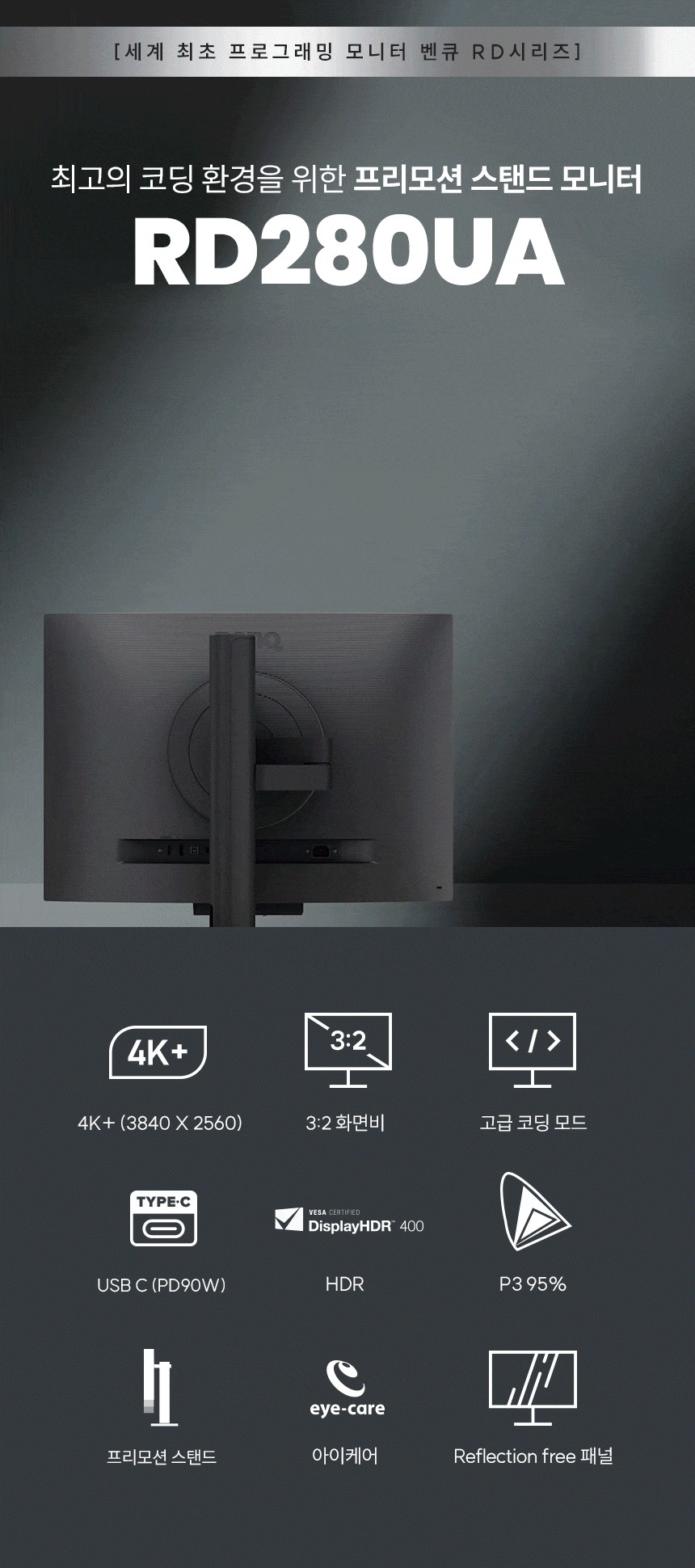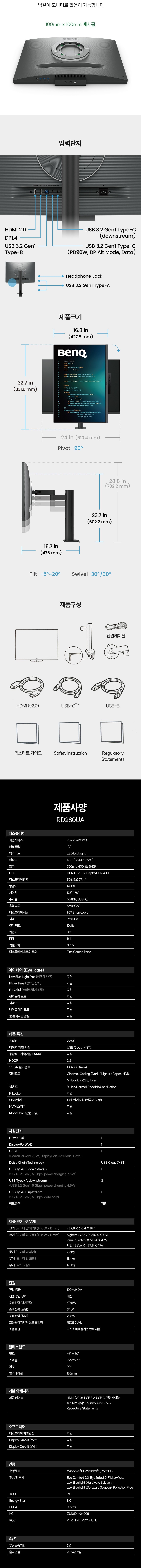 벤큐 RD280UA 아이케어 무결점 4K UHD 프로그래밍 코딩 개발자 프리모션암 모니터