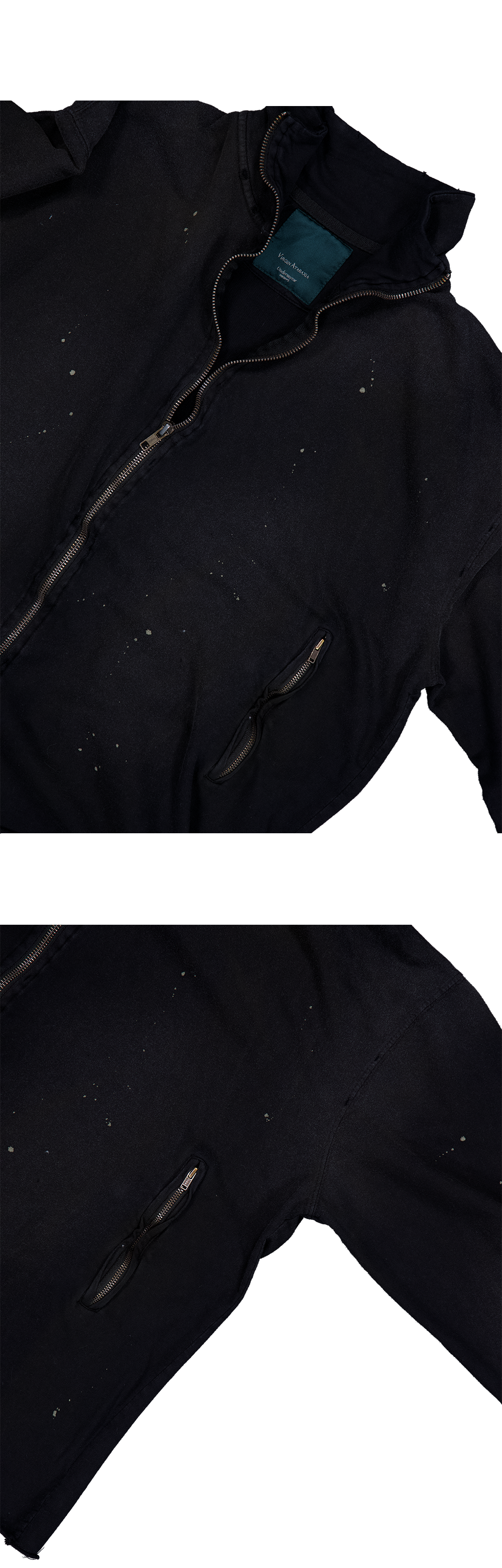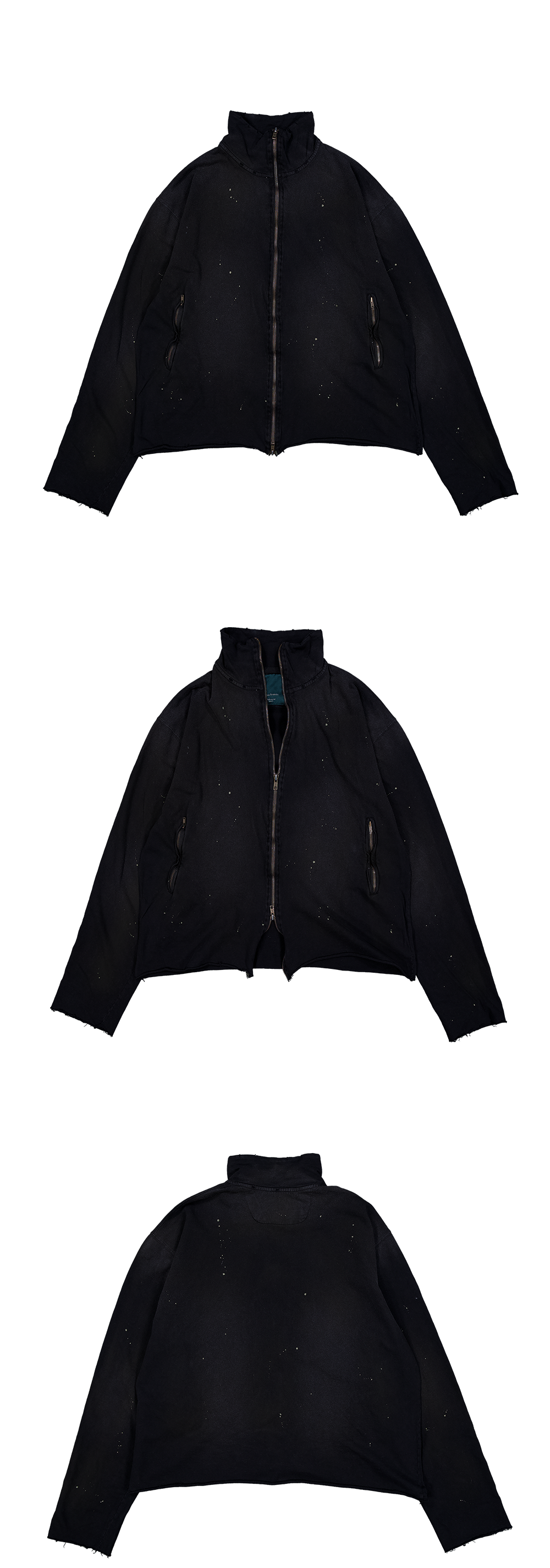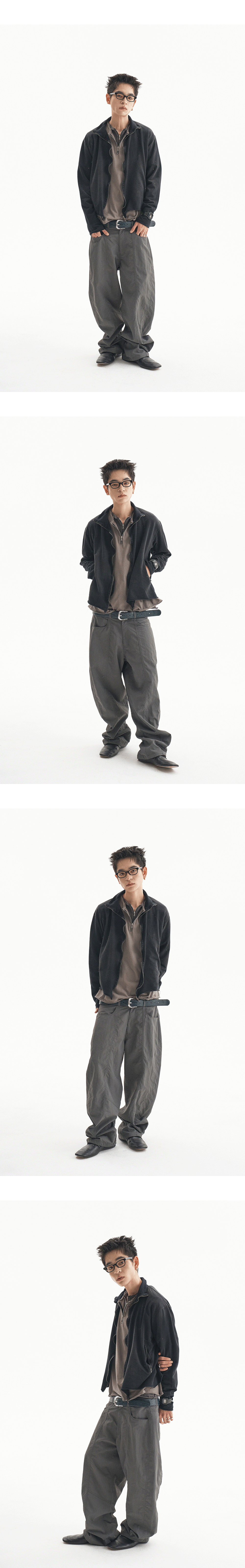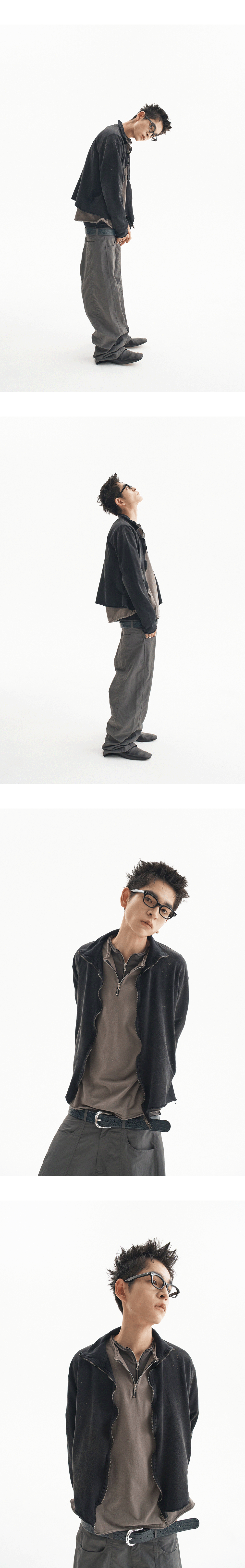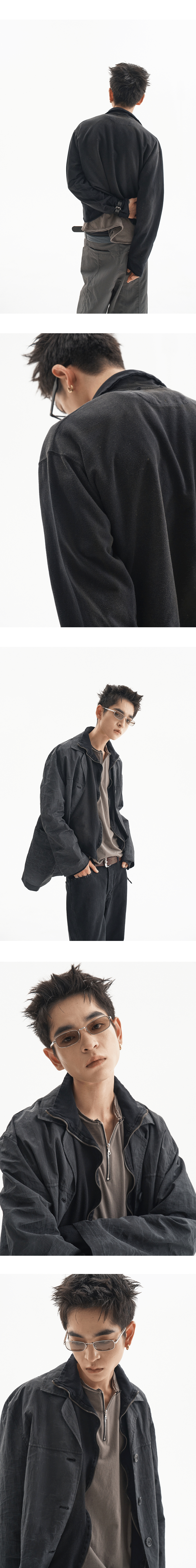 워싱으로 인한 물결 모양의 지퍼를 포인트로 한 슬림한 집업에 그런지한 디테일을 추가하여 제작하였습니다. MODEL : 180CM / 61KG WEARING SIZE : 1