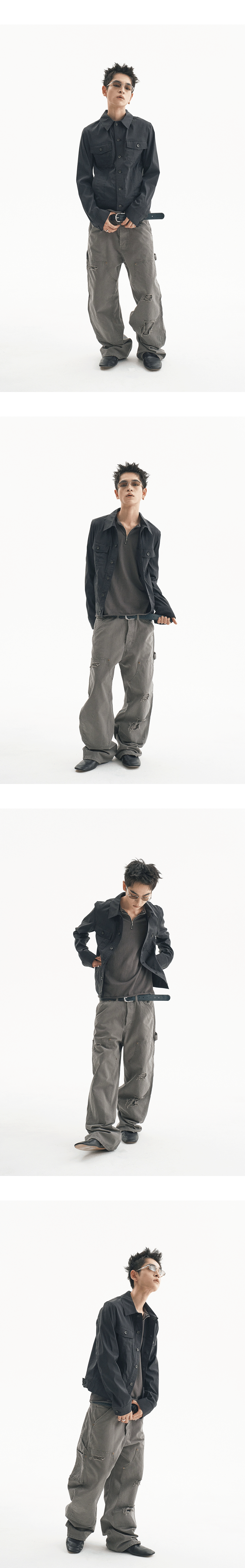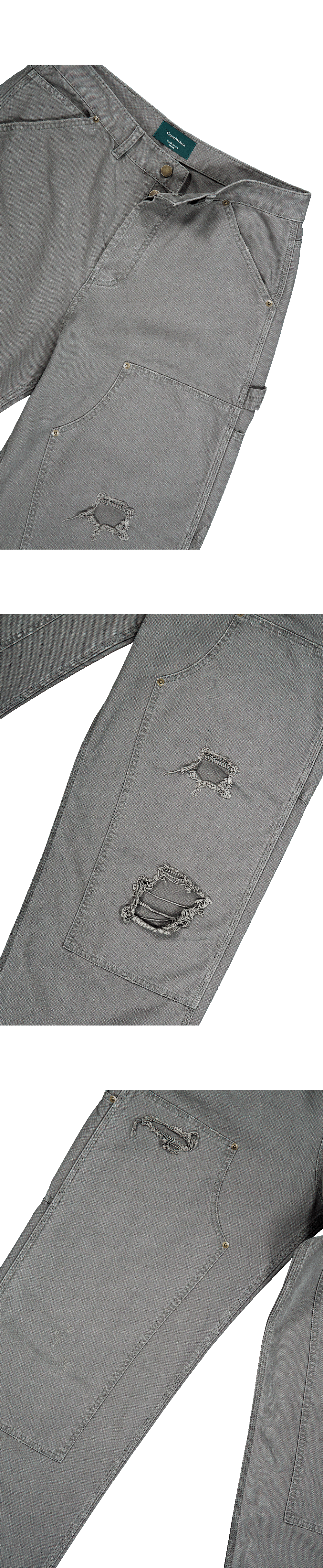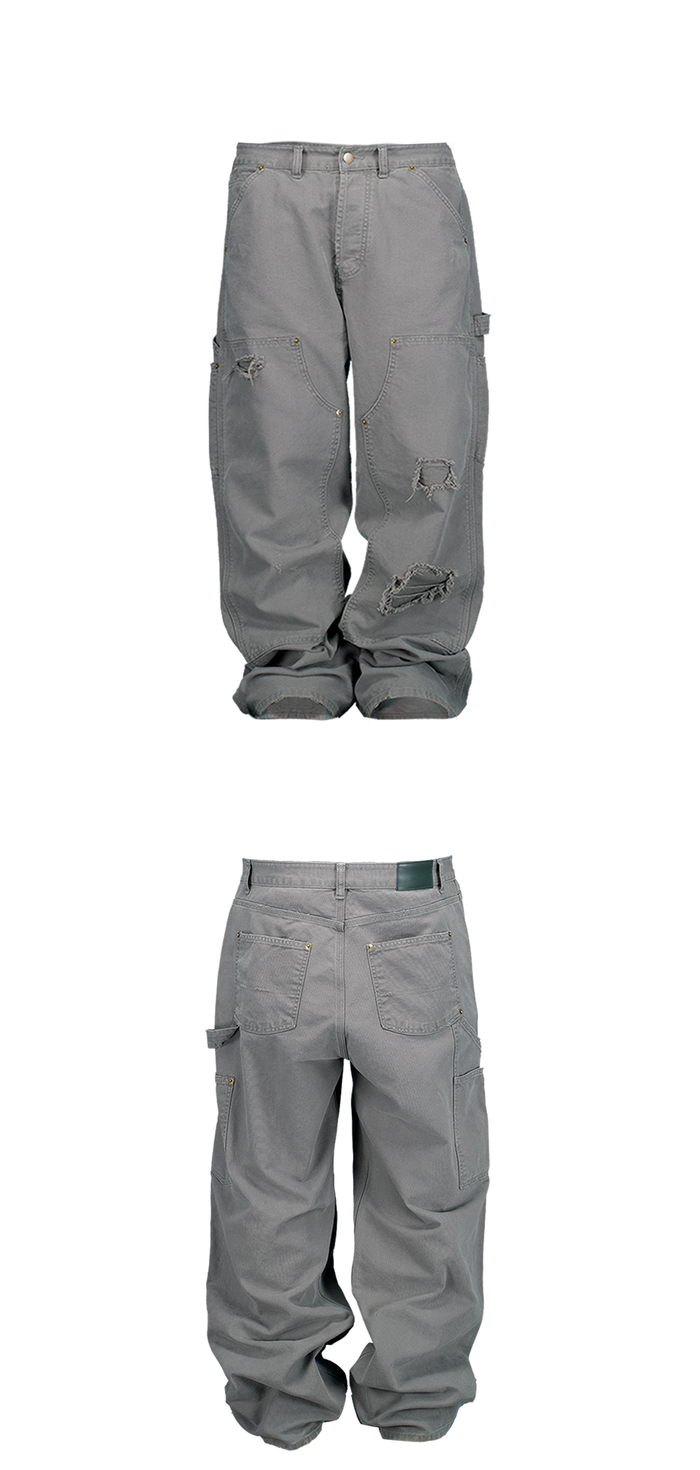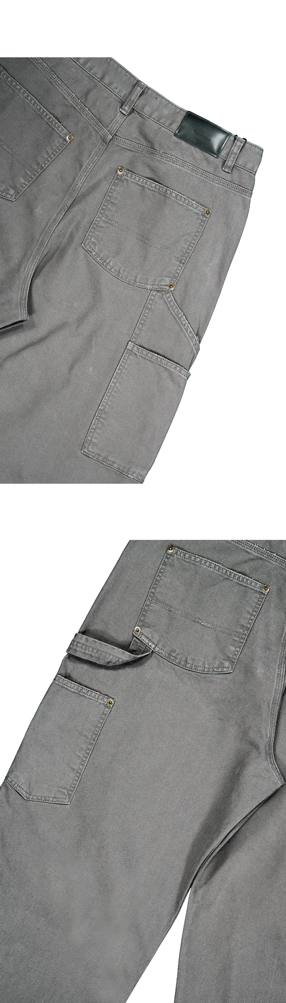 밀도 높은 캔버스를 강한 워싱으로 빈티지한 느낌으로 완성한 카키 그레이 더블 니 워크 팬츠입니다. MODEL : 180CM / 61KG WEARING SIZE : 0